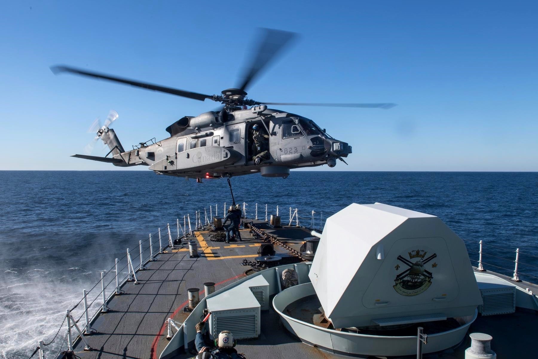 (VDQ004 - VDQ005) HMCS VILLE DE QUÉBEC conducting dry testing of the fueling facilities at the Nanisivik Naval Facility on Baffin Island in Nunavut - Aug 2019 (VDQ006) HMCS VILLE DE QUÉBEC’s CH-148 Cyclone, Avalanche, conducts a fo'c's'le transfer while sailing in the Atlantic Ocean during Operation REASSURANCE on January 12, 2019 // Photo: MCpl Andre Maillet, MARPAC Imaging Services (VDQ007) "Avalanche". The badge for the helo of HMCS VILLE DE QUÉBEC 332