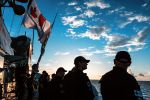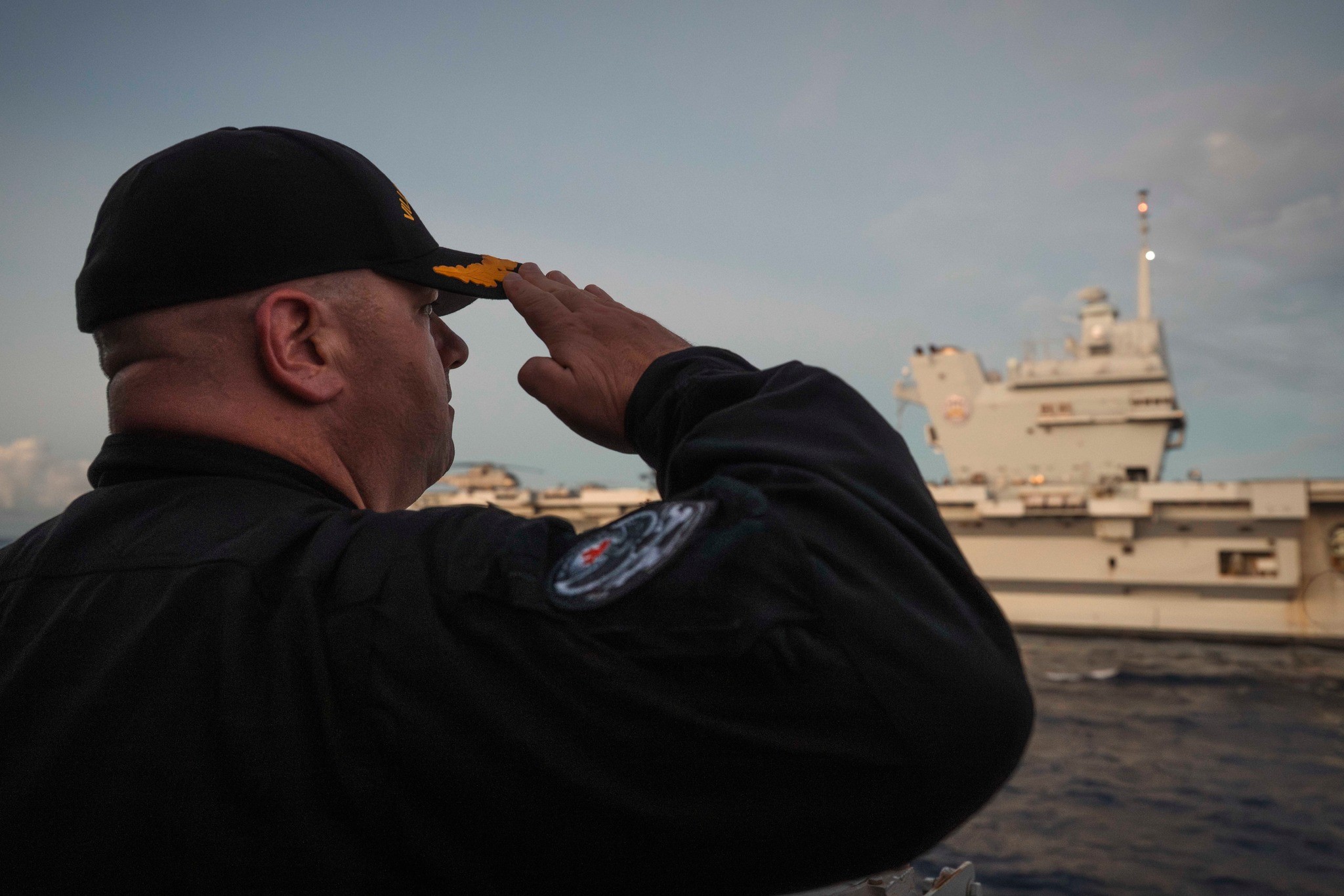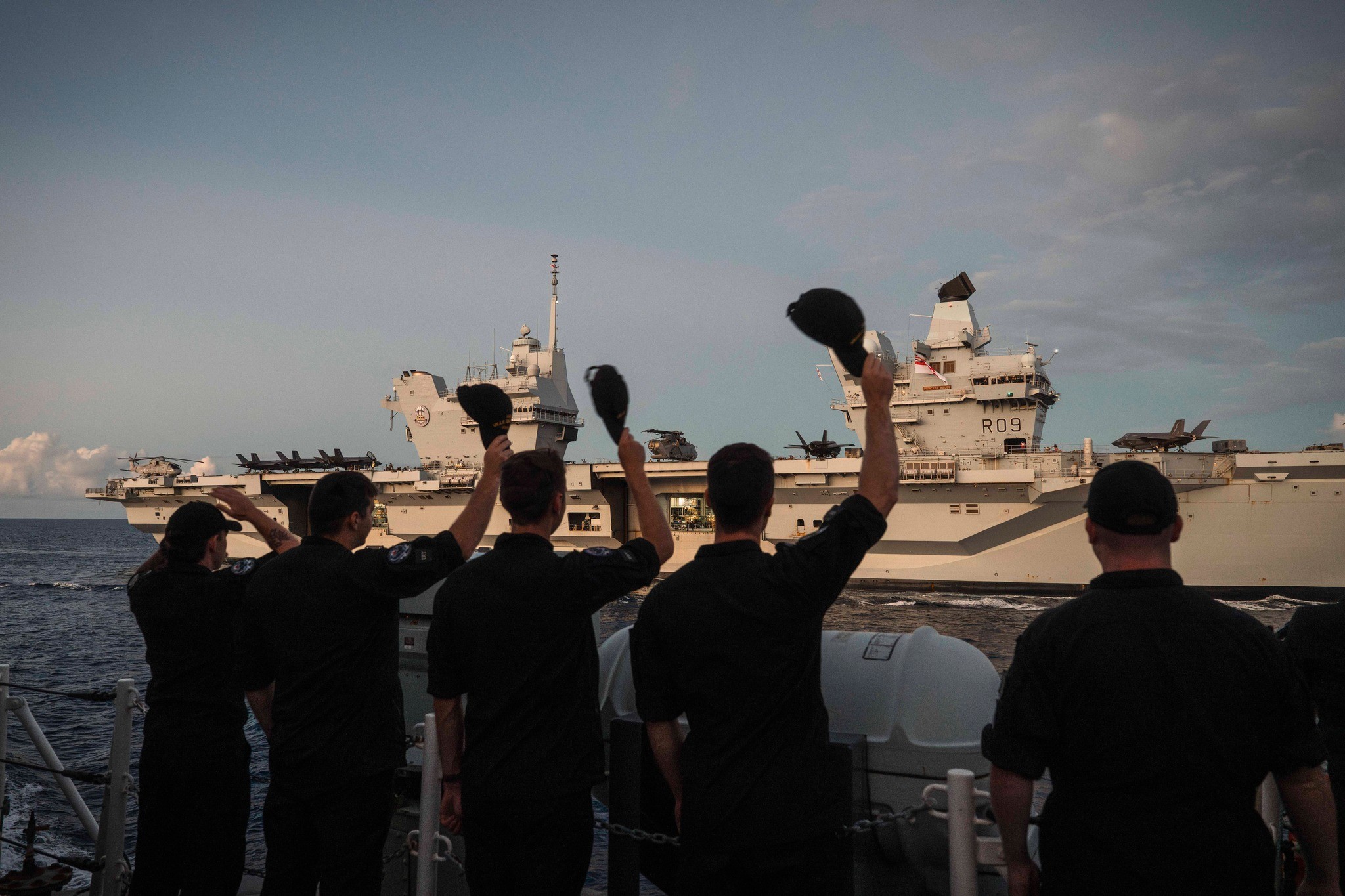 (VDQ011 - VDQ015) HMCS VILLE DE QUÉBEC bids a final farewell to HMS PRINCE OF WALES and CSG25. HMS Prince of Wales saw us off in style, with a fighter fly past and beautiful setting sun. As we head east toward the Pacific Ocean, we wish CSG25 fair winds and following seas as they continue on Op HIGHMAST. // Photographer: Corporal Brendan Gamache, Formation Imaging Service