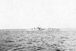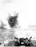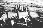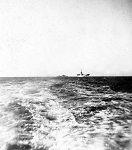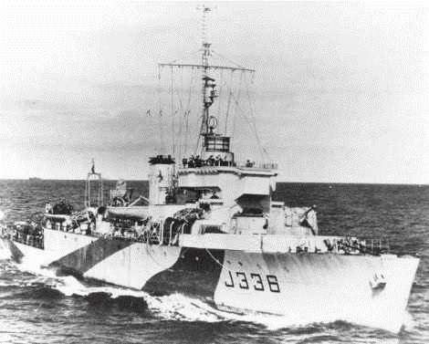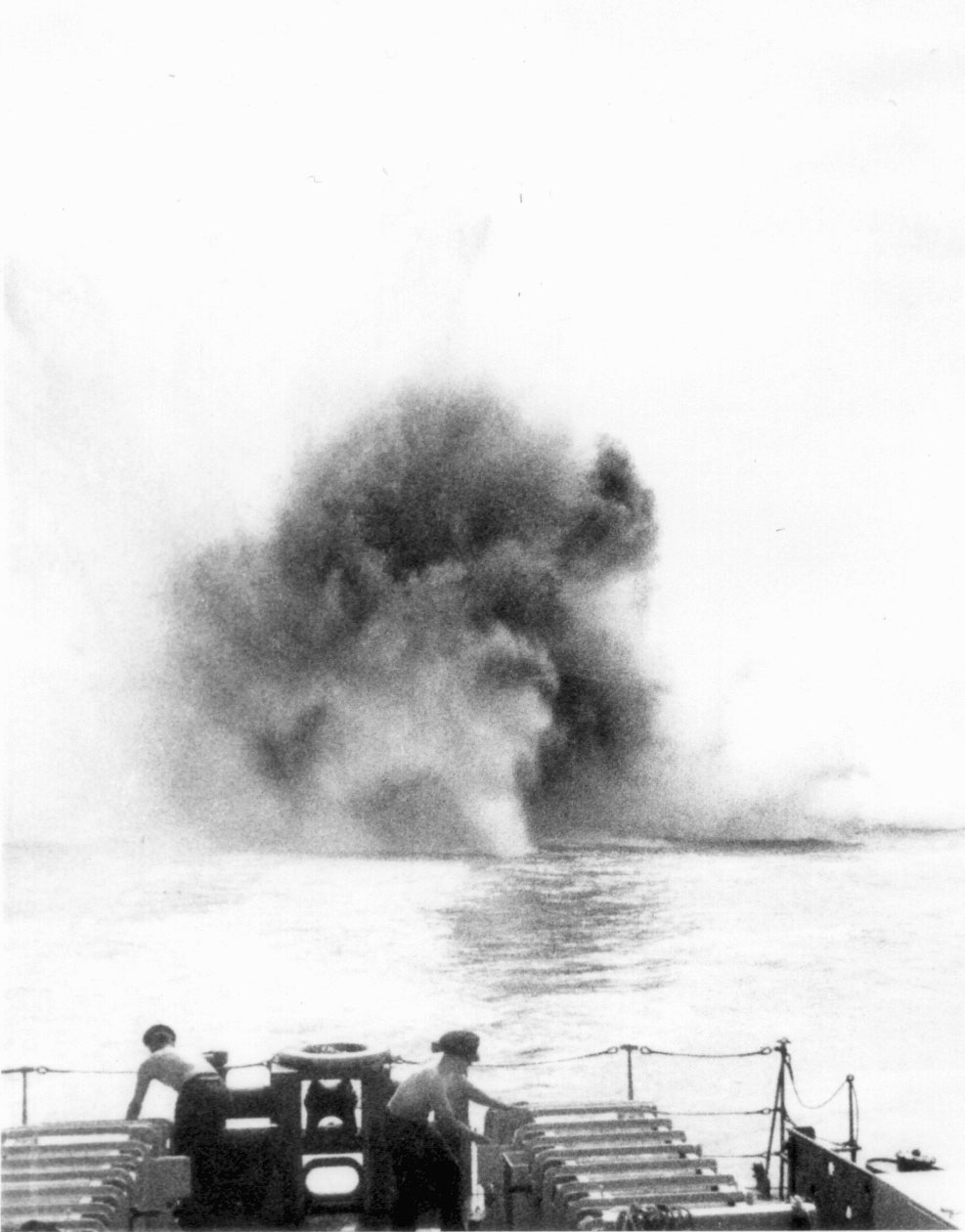 (JM11) HMCS PRESCOTT K161 photographed from HMCS WALLACEBURG J336 (JM12-JM13) Jim McAlister signalling USN Blimp (JM14-JM15) Depth charges exploding astern of HMCS WALLACEBURG J336
