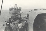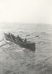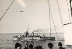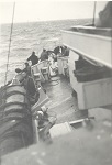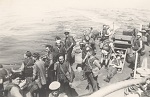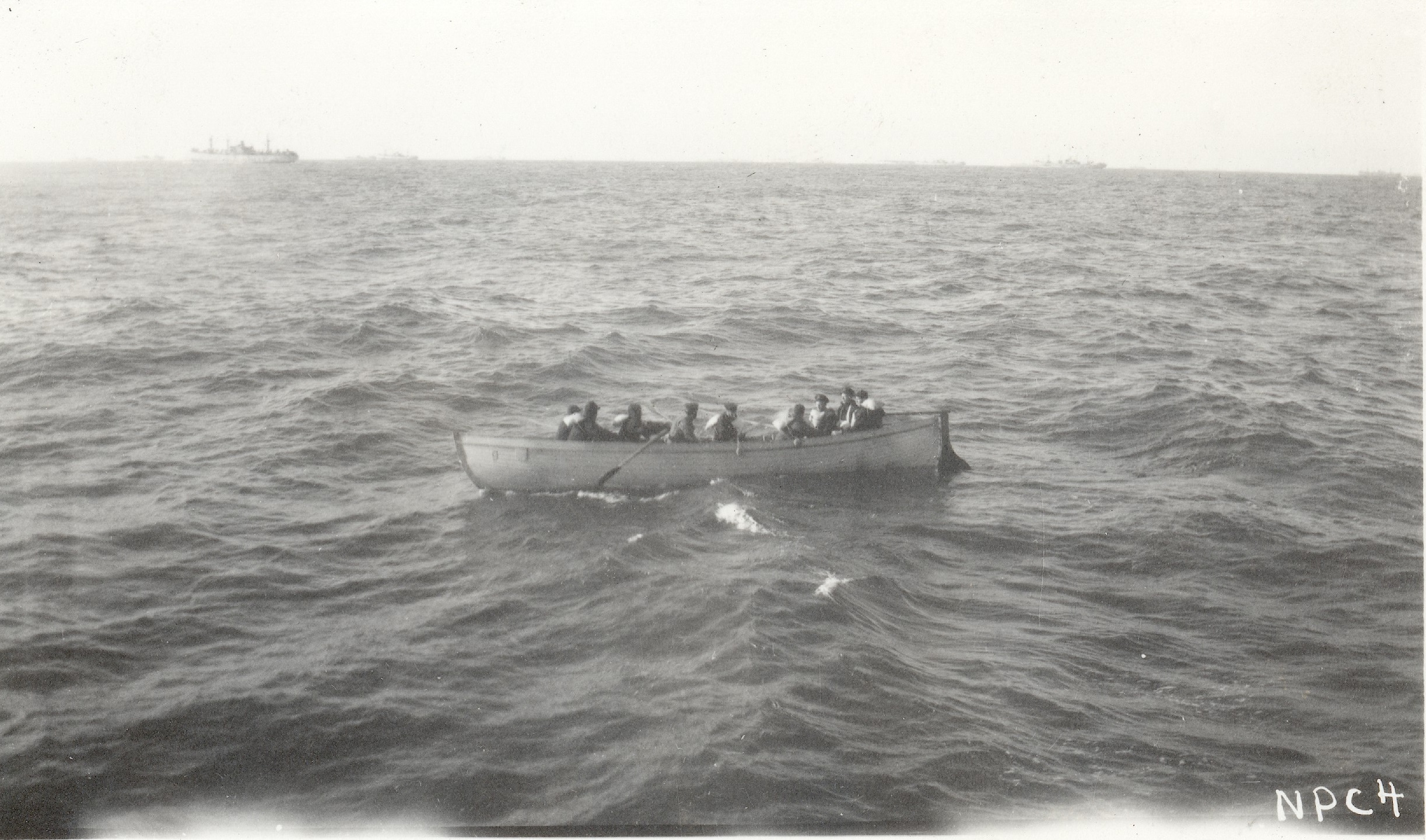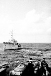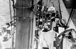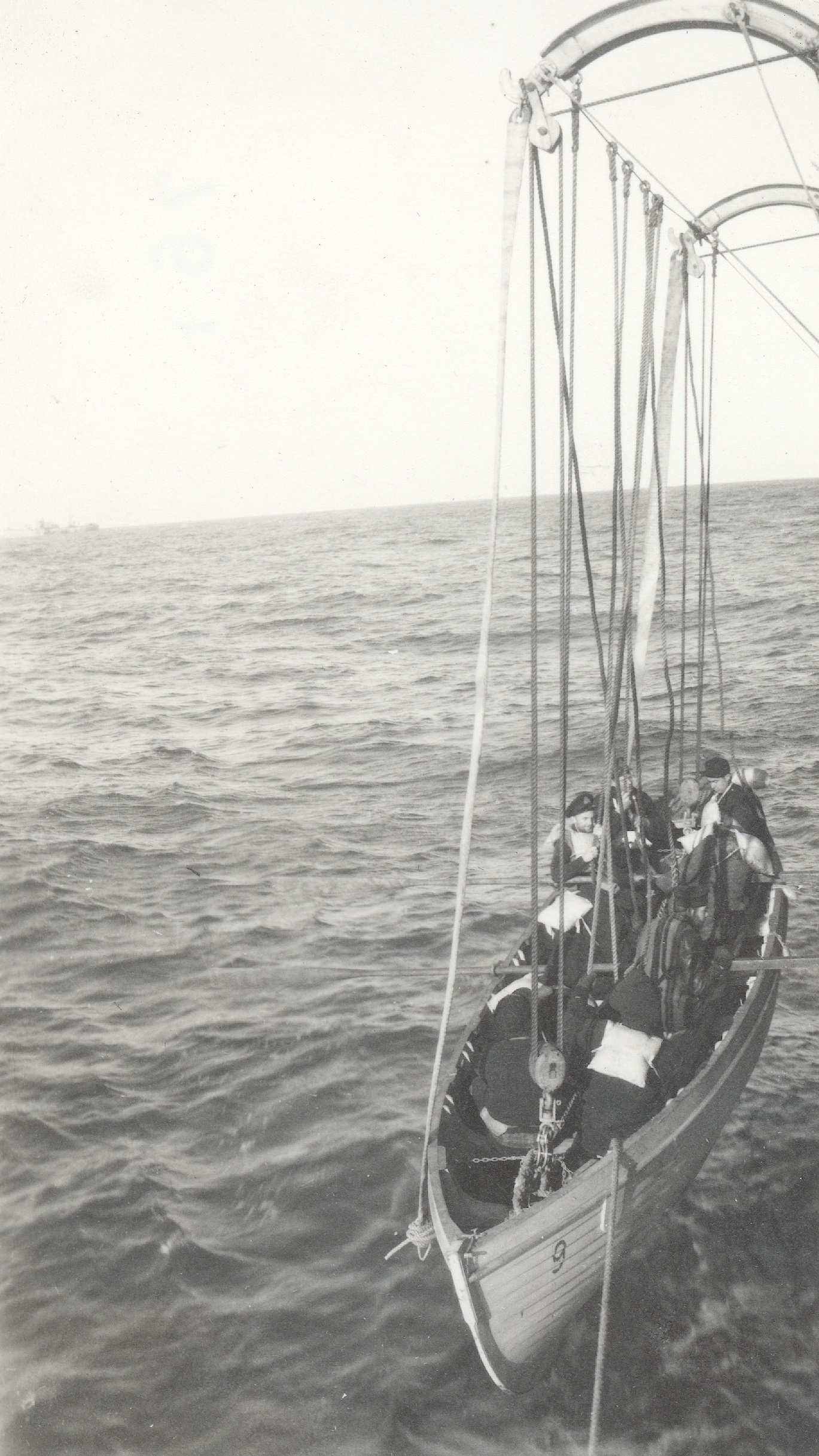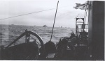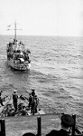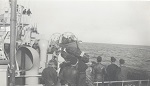 (WD102) Boats crew from HMCS WALLACEBURG heading out to another ship in convoy to pick up a casualty (WD102-WD106) WALLACEBURG'S boat returns and is hoisted up