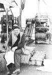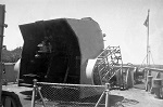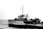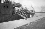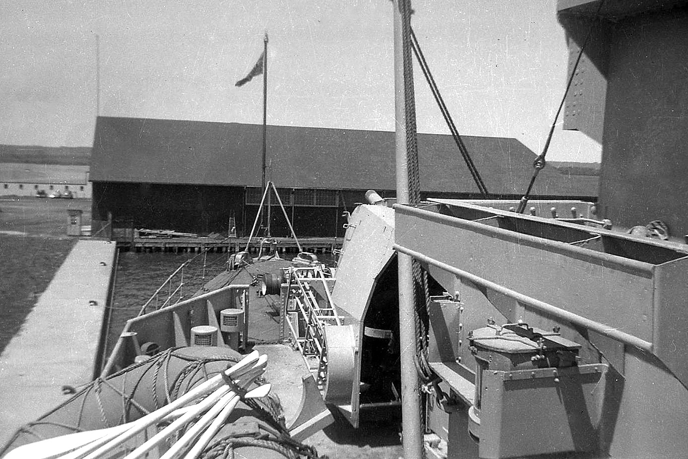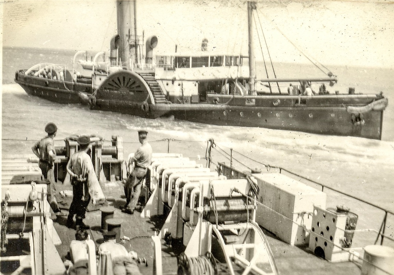 (WD115) Unknown evolution on HMCS WALLACEBURG J336 The crew seem pretty relaxed - though all are wearing life jackets and carrying their gas masks. One sailor by the depth charge rails looks very fatigued (WD116) Two sailors wearing gas masks sitting at after gun on HMCS WALLACEBURG J336 (WD117) Three sailors by the after gun of HMCS WALLACEBURG J336 - one looks like he is ready to hit the beach. WALLACEBURG appears to be moored alongside an island in the harbour (WD118) Robust Class dockyard paddle tug HMS SANDBOY W12 passing astern of HMCS WALLACEBURG J336