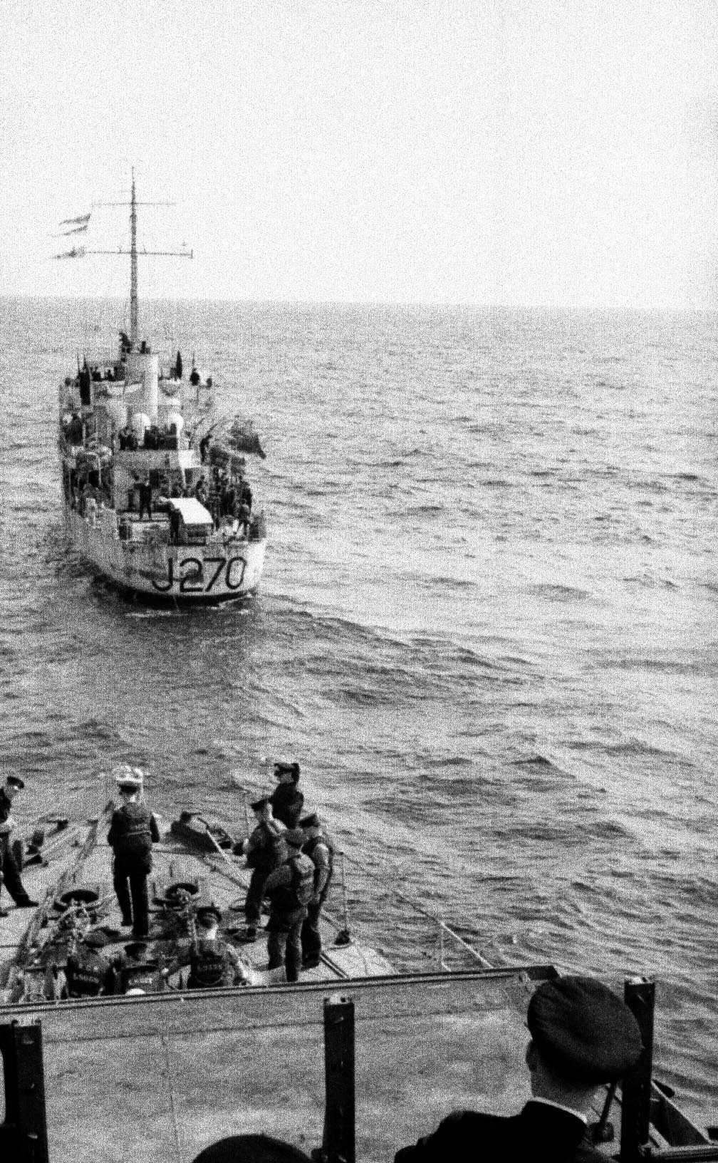 (VS21) Searchlight platform on HMCS WALLACEBURG J336 (VS22) Forward gun with missile racks on HMCS WALLACEBURG J336 (VS23) HMCS WALLACEBURG J336 - boat deck just aft the funnel (VS24) HMCS WARRIOR and HMCS MICMAC (VS25) HMCS MICMAC Note: it is presumed VS24 and VS25 were taken from HMCS WALLACEBURG