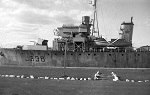 (WD119) HMCS BROCKVILLE J270 tied to a compass buoy, St. George's Harbour, Bermuda - Mar 1945. BROCKVILLE was in Bermuda for WUPS at the same time as WALLACEBURG