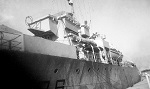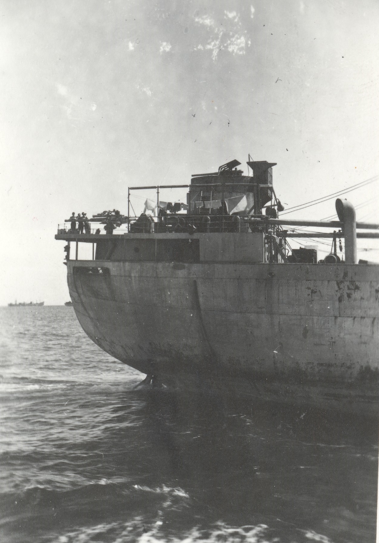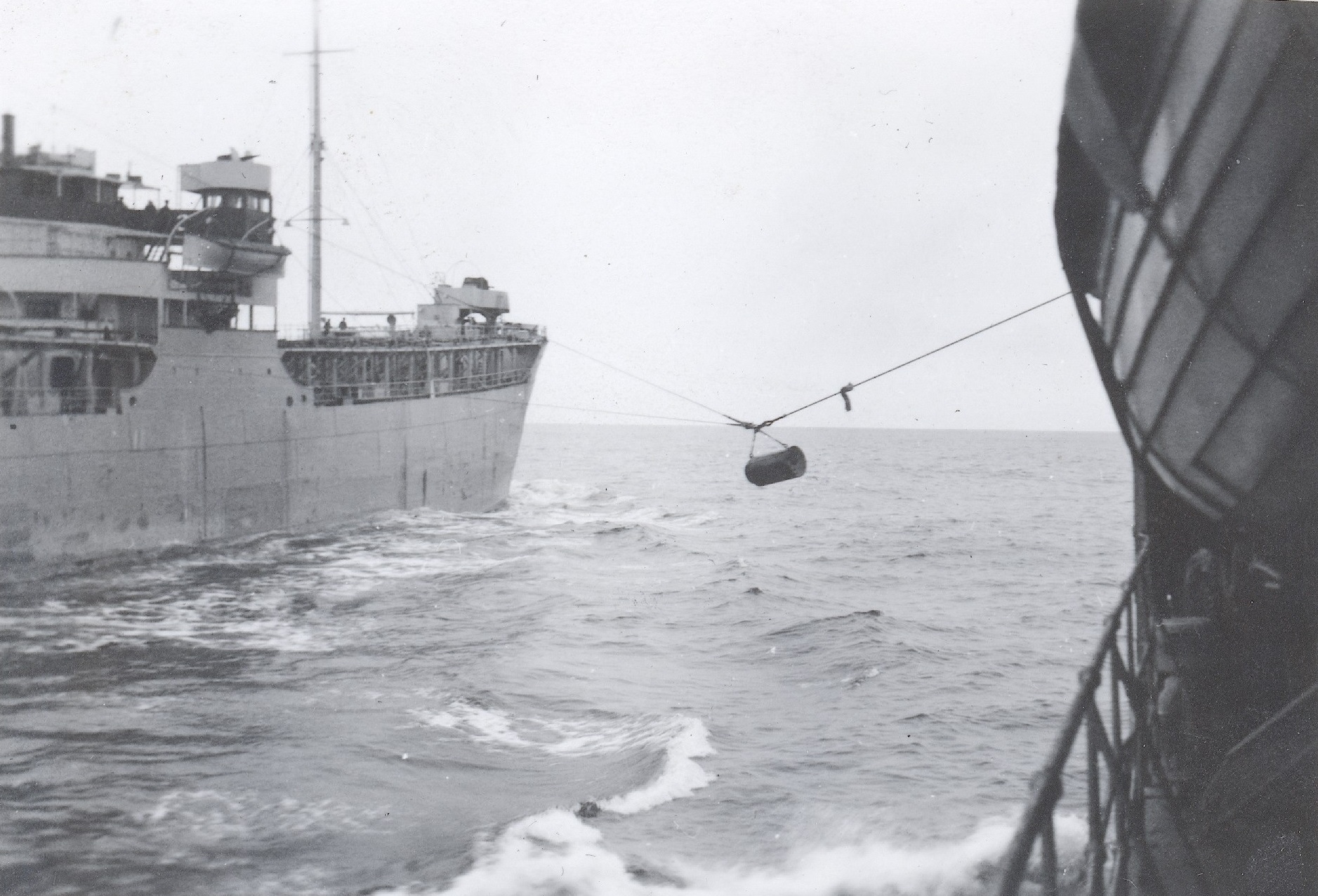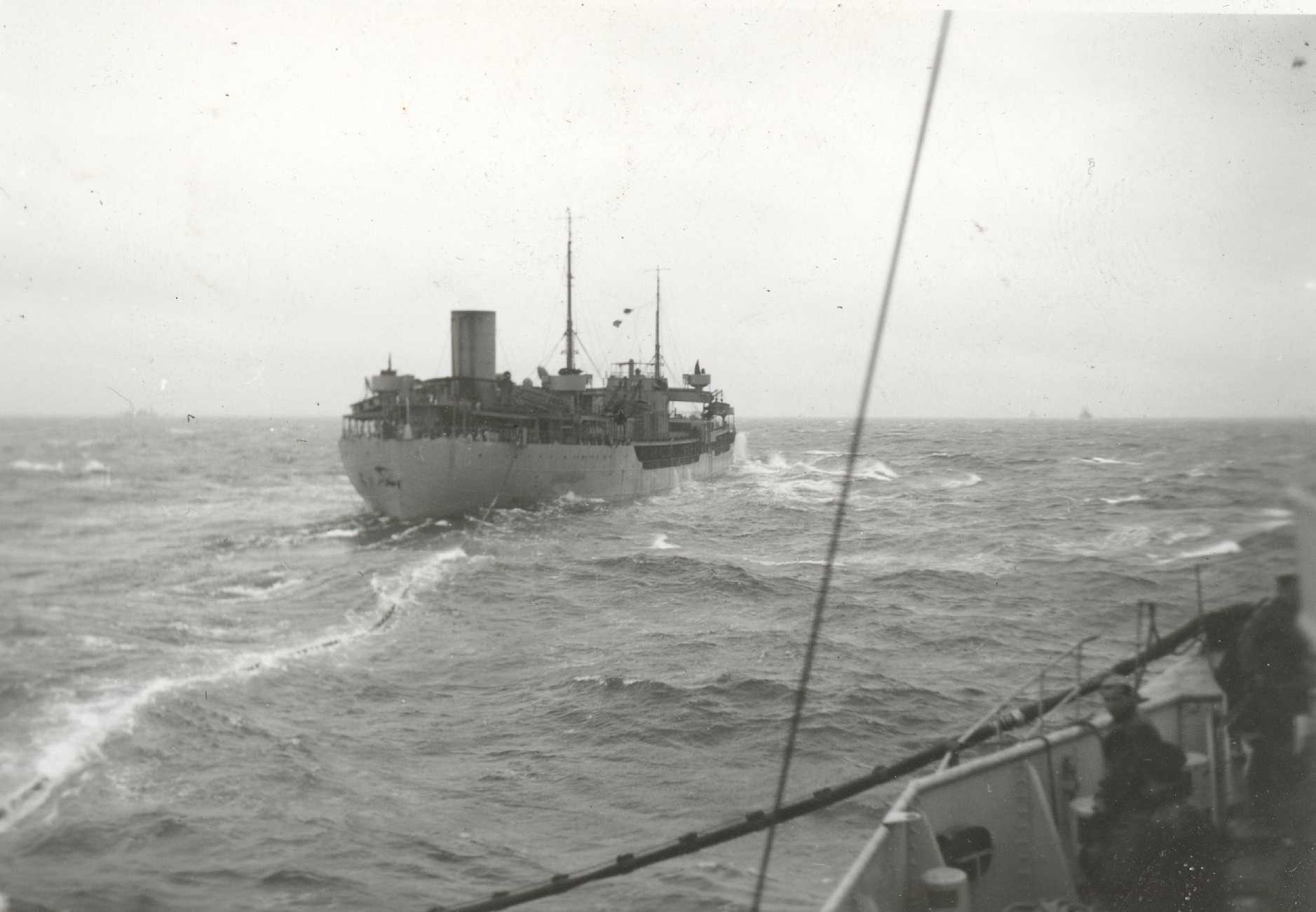 (WD77-WD78) HMCS WALLACEBURG J336 conducting a stern fueling from a tanker in convoy (WD79) HMCS WALLACEBURG J336 conducting a stern fueling from a tanker in convoy (WD80) HMCS WALLACEBURG J336 passing near the stern of a tanker in convoy - possibly after completion of a fueling (WD81) Sailors on WALLACEBURG J336 by the forward gun and below the carley floats