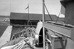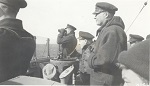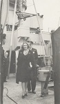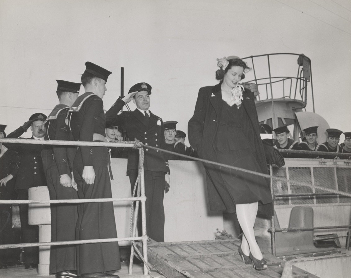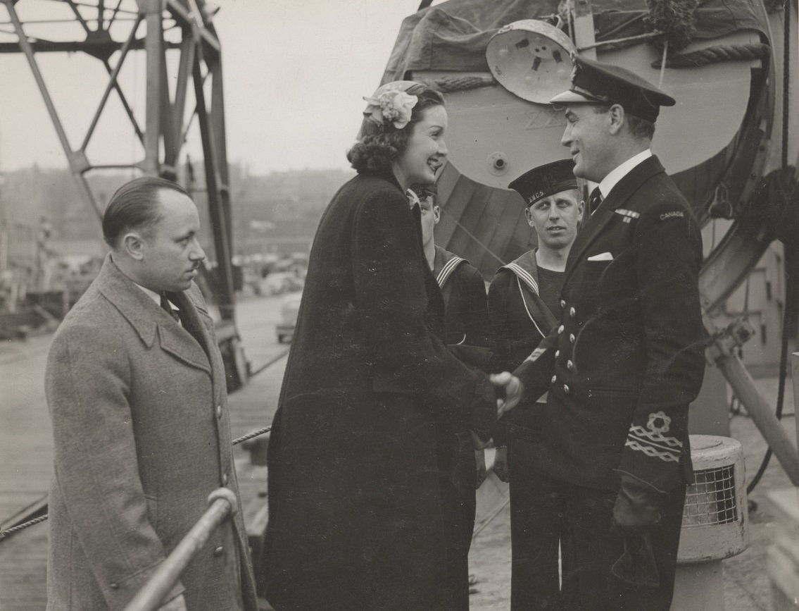 (WD100) Visit over, Gail Patrick, with LCdr Roberts following behind, crosses the boat deck just aft of the bridge of HMCS WALLACEBURG, heading towards the brow by the searchlight platform - No Neg # on photo (WD101) LCdr Robert A.S. MacNeil, RCNVR, CO salutes Gail Patrick as she departs HMCS WALLACEBURG - RCN Neg # HN1111