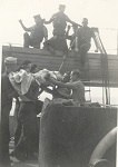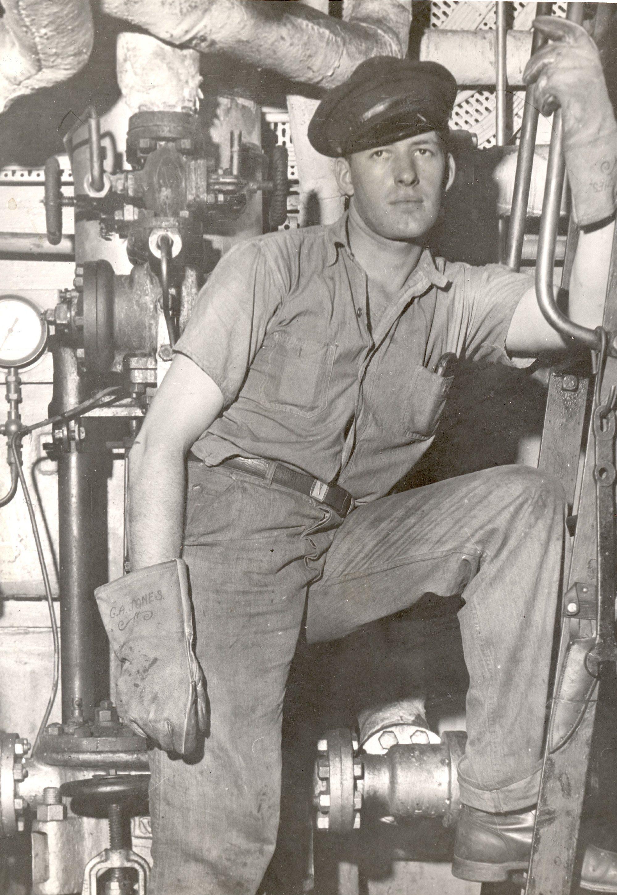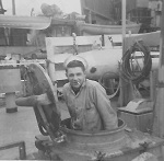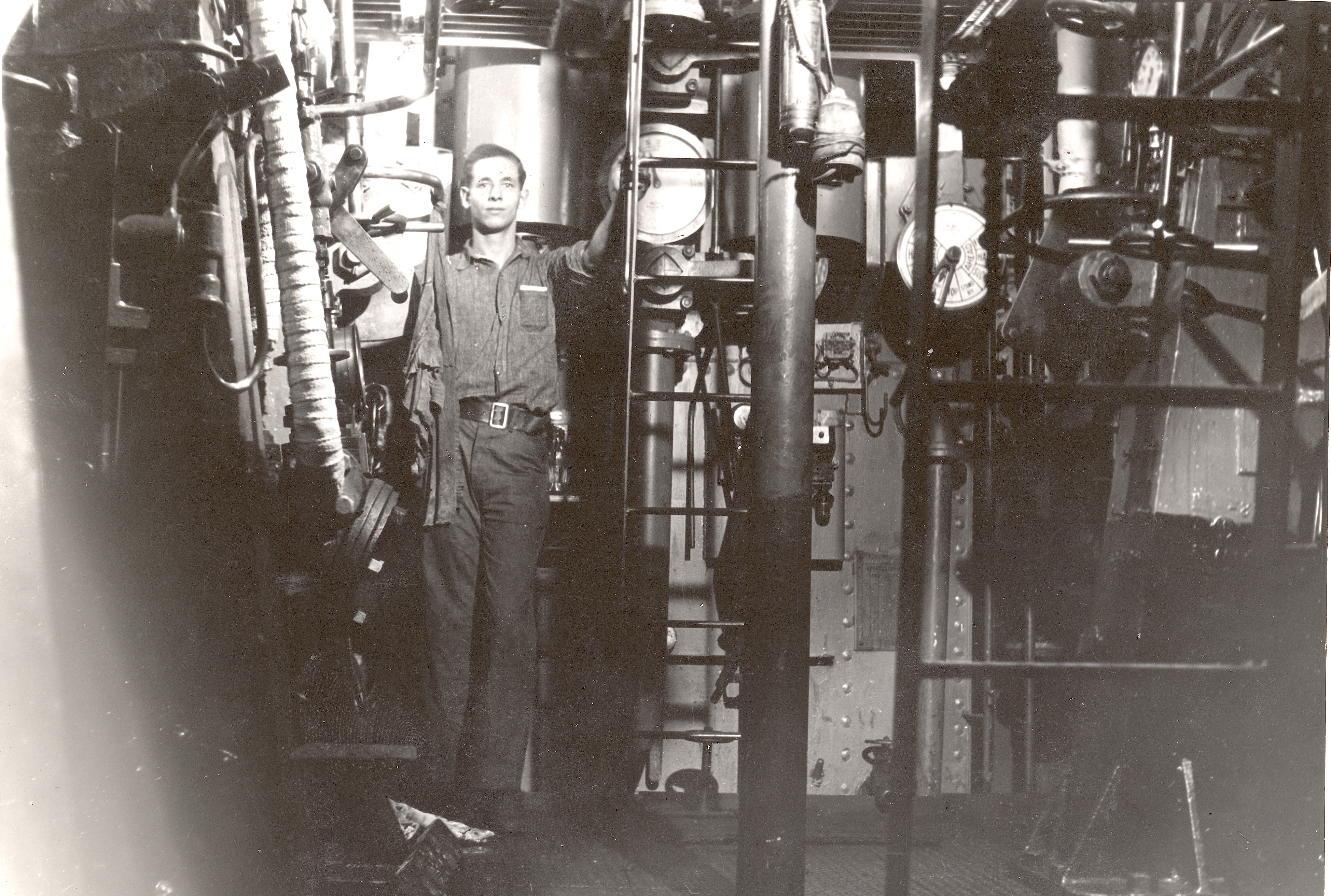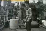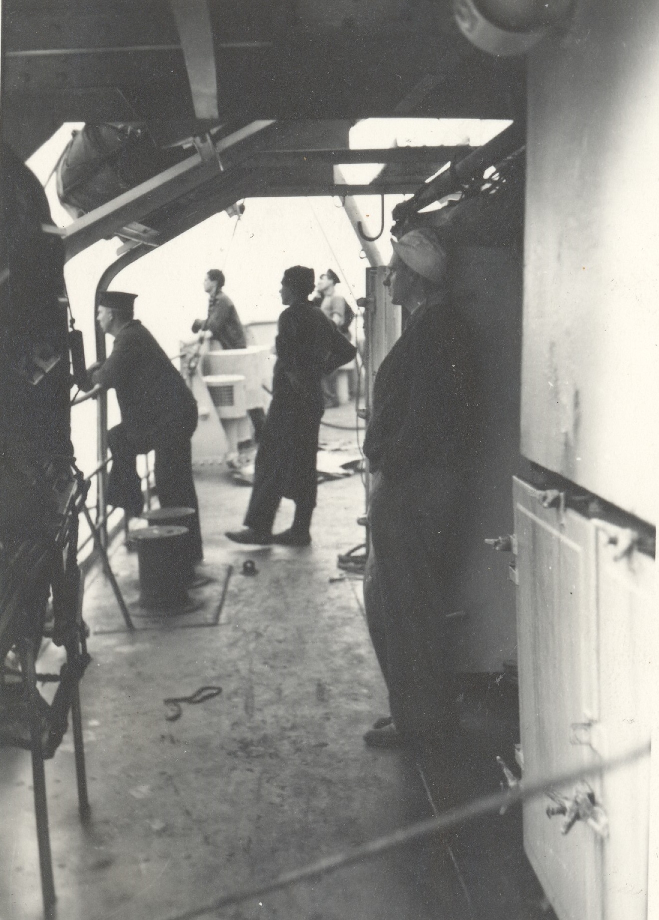 (WD82) HMCS WALLACEBURG J336 transferring (receiving) depth charges at sea (WD83) Convoy seen from HMCS WALLACEBURG J336 (WD84) Looking aft down the port side of HMCS WALLACEBURG J336. Unknown sailor looking up at the camera (WD85) Stoker Petty Officer G.A. Jones in the boiler room - believed to be on HMCS WALLACEBURG J336 (WD86) Unknown sailor in the engine room - believed to be on HMCS WALLACEBURG J336
