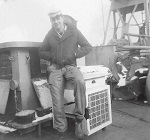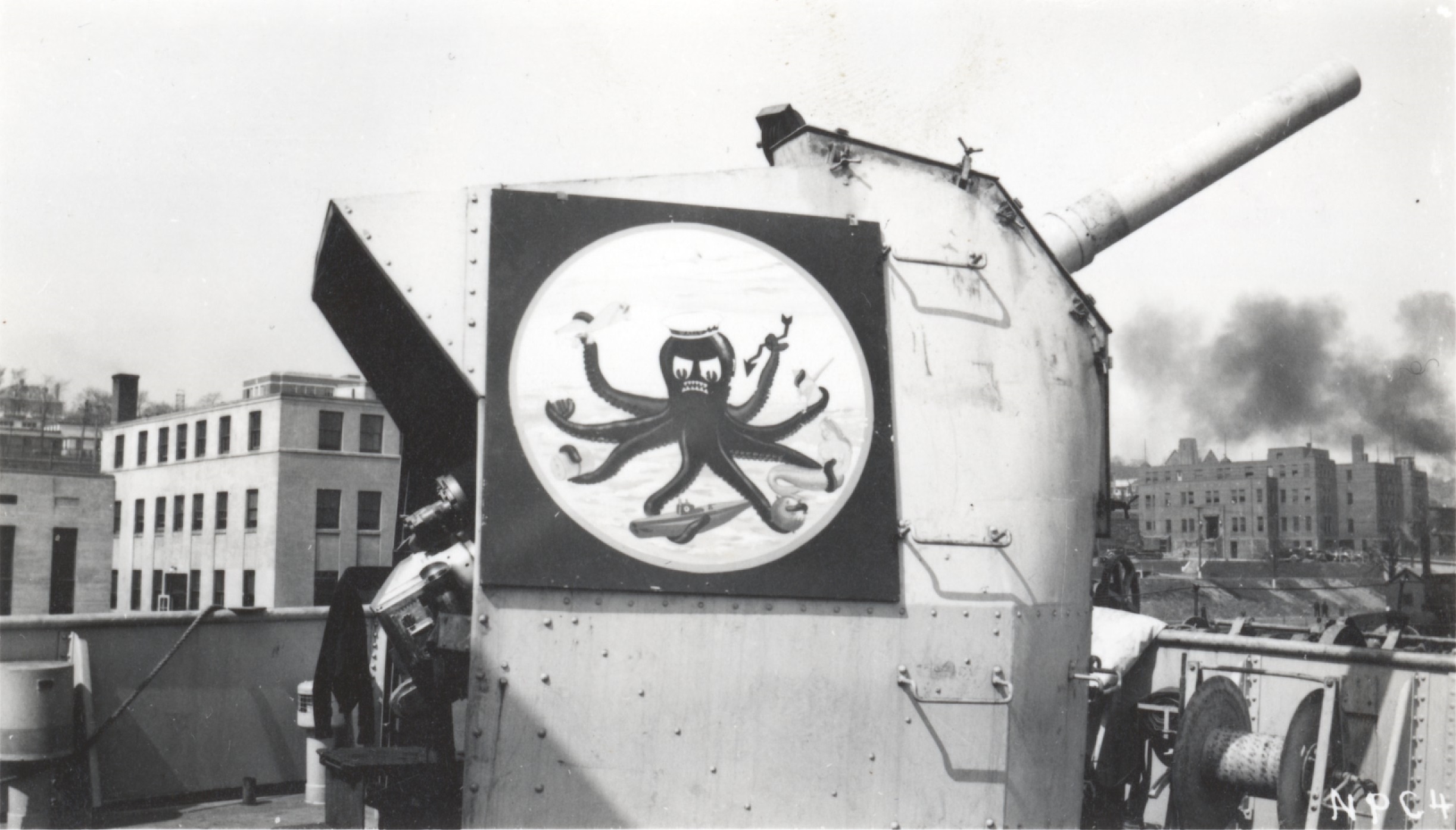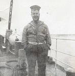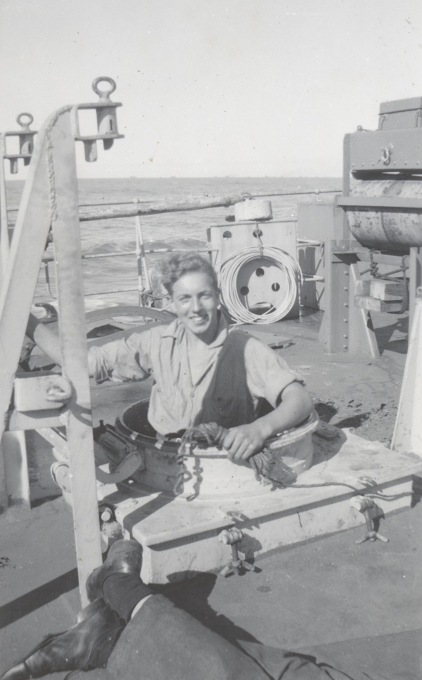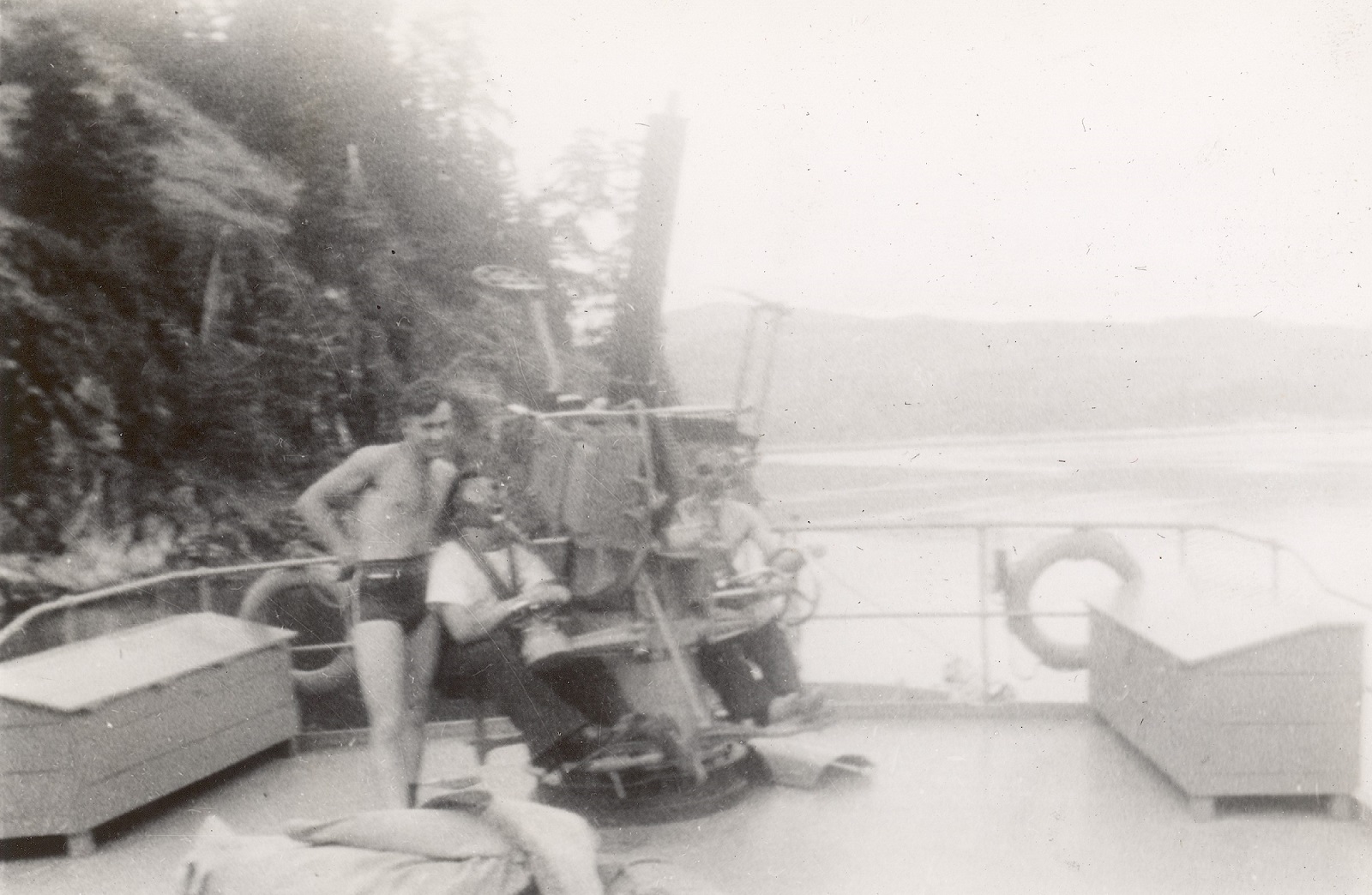 (WD87) John Walsh onboard HMCS WALLACEBURG J336 with ship's mascot (WD88) Smith onboard HMCS WALLACEBURG J336 (WD89) HMCS WALLACEBURG J336 digs in and shipping water over her bow (WD90) Unknown sailor by the signal lamp of HMCS WALLACEBURG J336 (WD91) Three members of the gun's crew at the forward gun mount on HMCS WALLACEBURG K336
