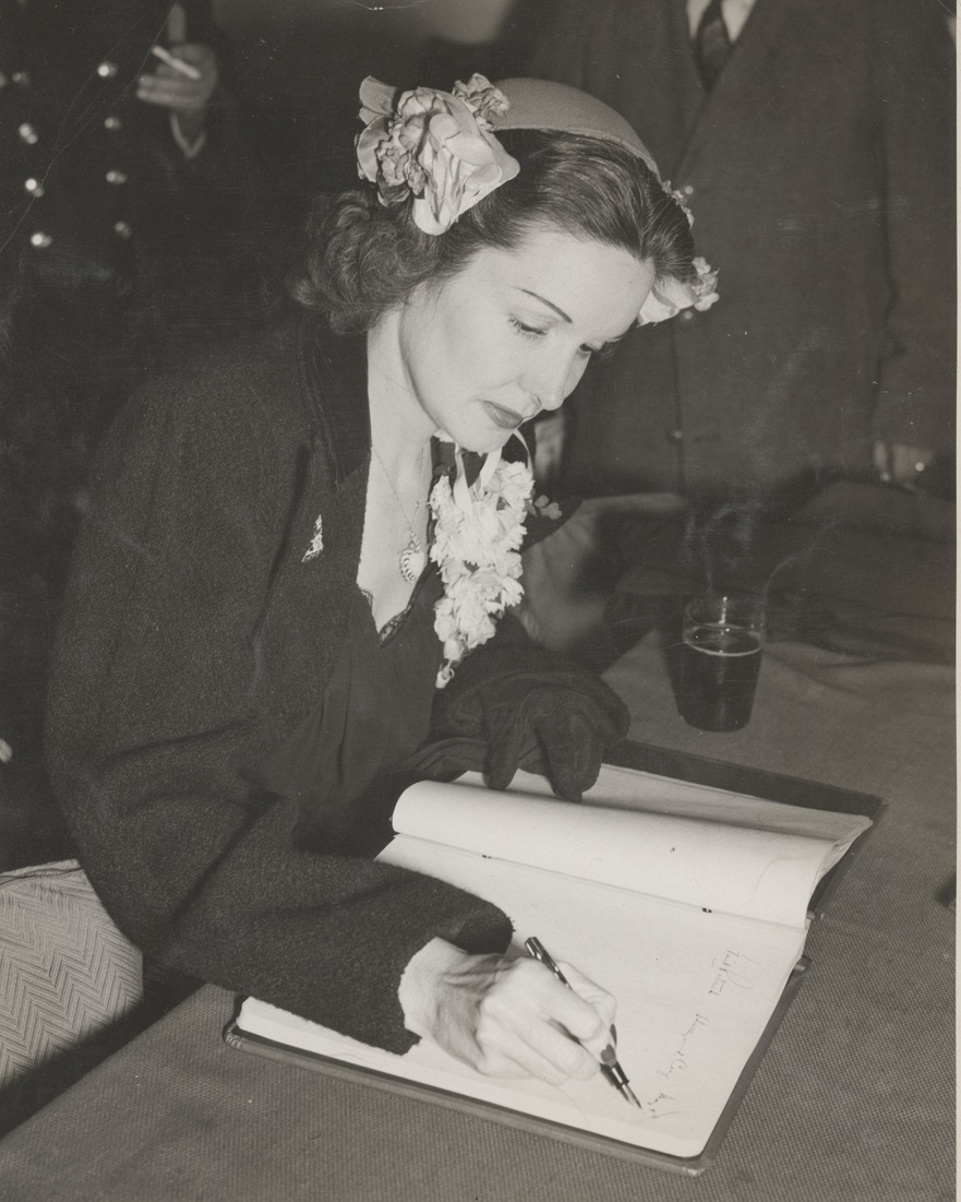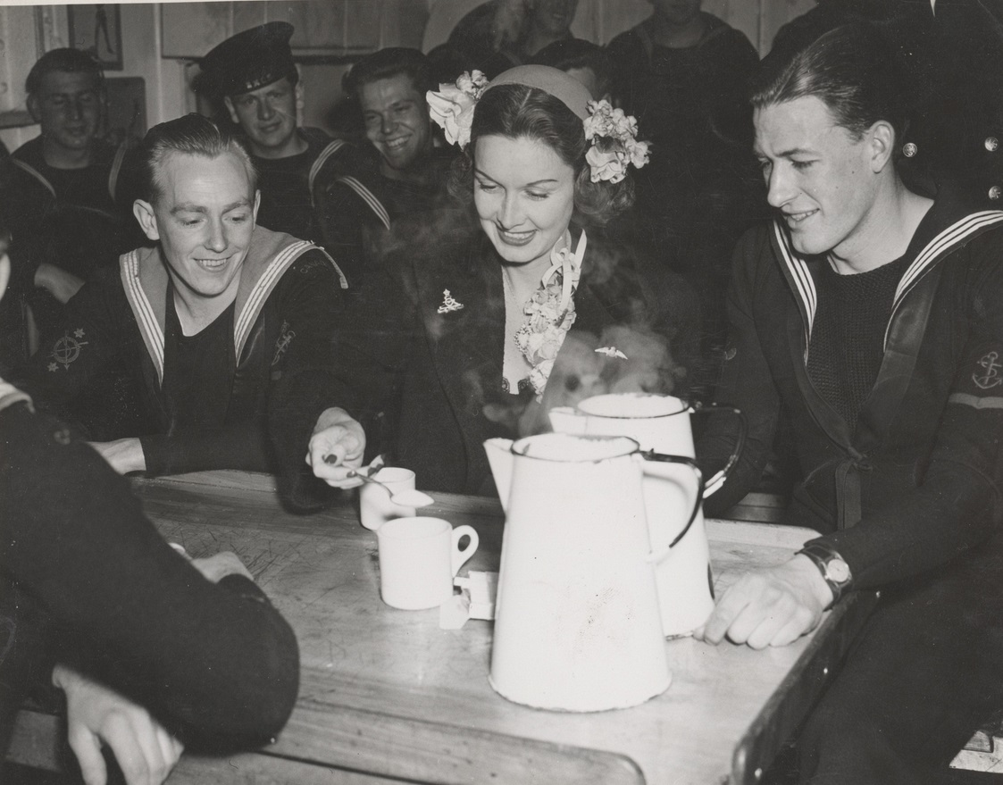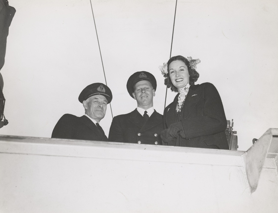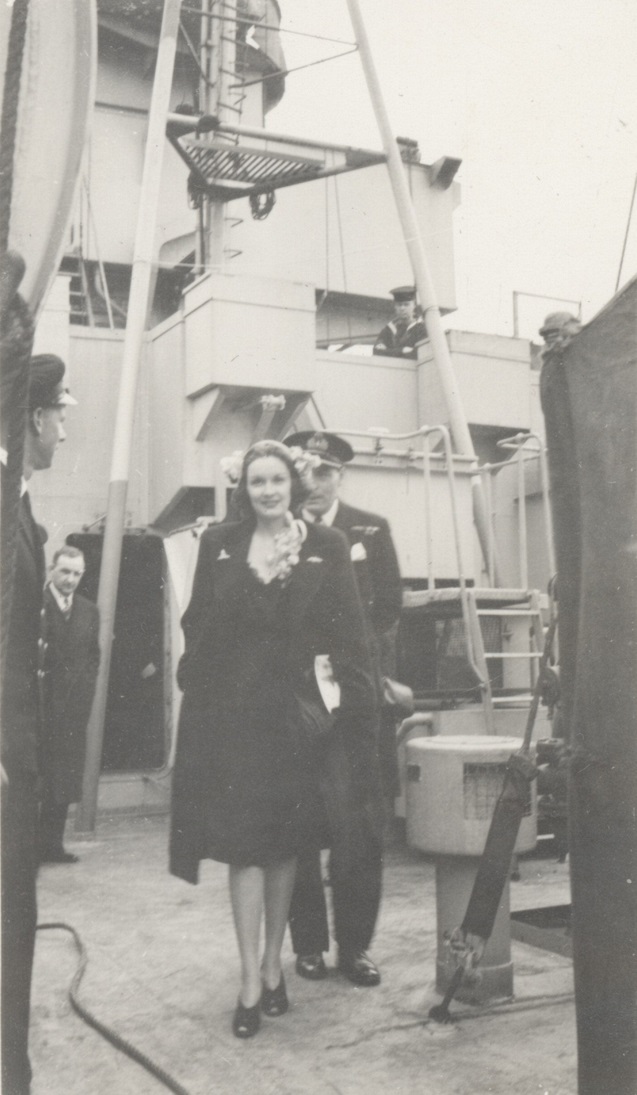 Actress / Movie Star Gail Patrick visits HMCS WALLACEBURG J336 Royal Navy Photograph stamp on back of photos Passed by Naval Censor July 3, 1944