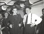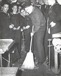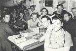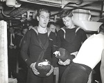 (WD108) The ship's cox'n (centre) addressing "OS" Lorne Main (left) while the CO of the day (right) looks on - RCN NEG # SY 132-12 (WD109) "OS" Main sweeping the seaman's mess while the crew looks on - RCN NEG # SY 132-13 (WD110) CO for the Day (left) and the newly demoted "OS" Main (Lt Lorne Main) - RCN NEG # SY 132-14 (WD111) Ratings in the seaman's mess on HMCS WALLACEBURG J336 enjoying a few Christmas snacks - RCN NEG # SY 132-15 (WD112) Christmas ditty bags being handed out to the crew of HMCS WALLACEBURG J336 - RCN NEG # SY 132-16
