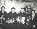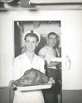 (WD113) The ships cook brings out the Christmas turkey - cooked to a golden brown - RCN NEG # SY 132-17 (WD114) A band for some Christmas music aboard HMCS WALLACEBURG J336 - RCN NEG # SY 132-18