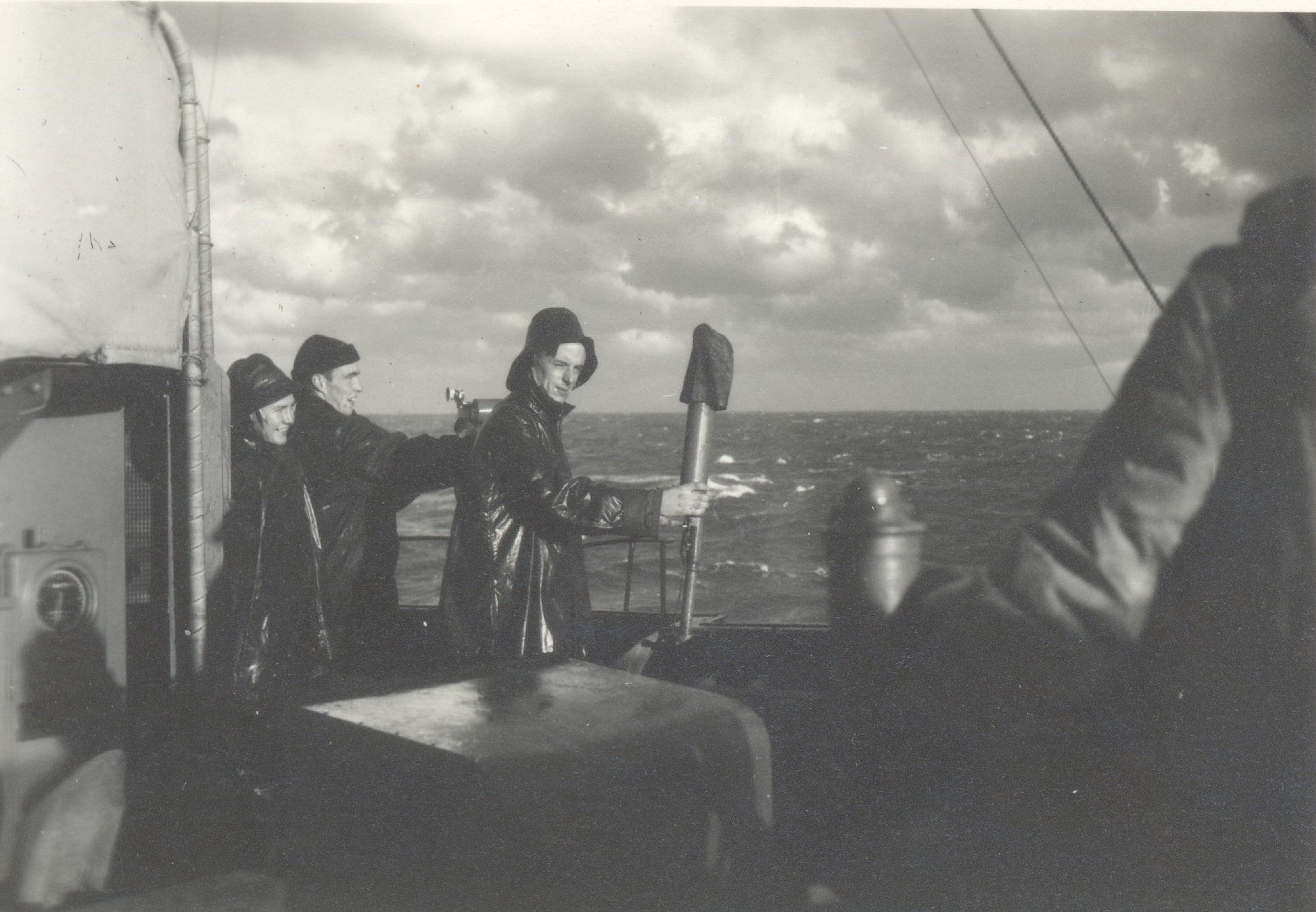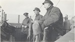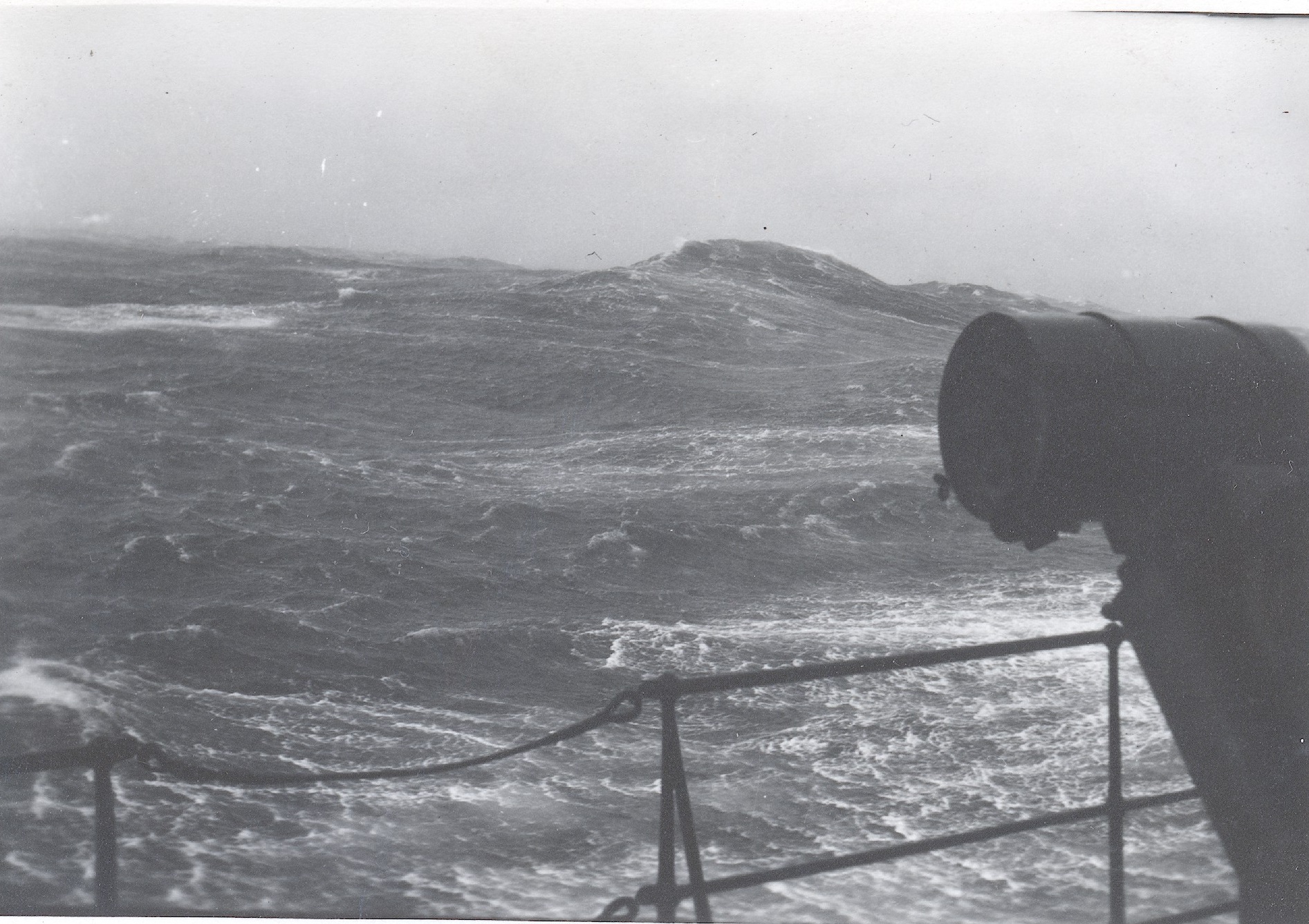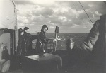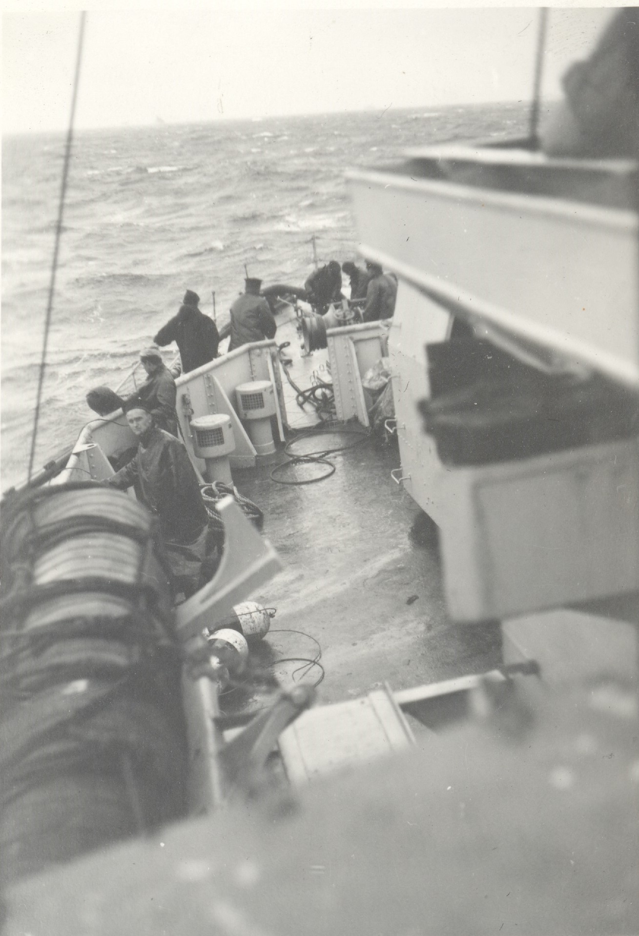 (WD67-WD68) HMCS WALLACEBURG J336 in rough seas. View from beside the starboard side depth charge thrower (WD69-WD71) Officers on the bridge of HMCS WALLACEBURG J336