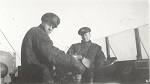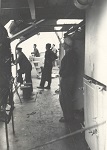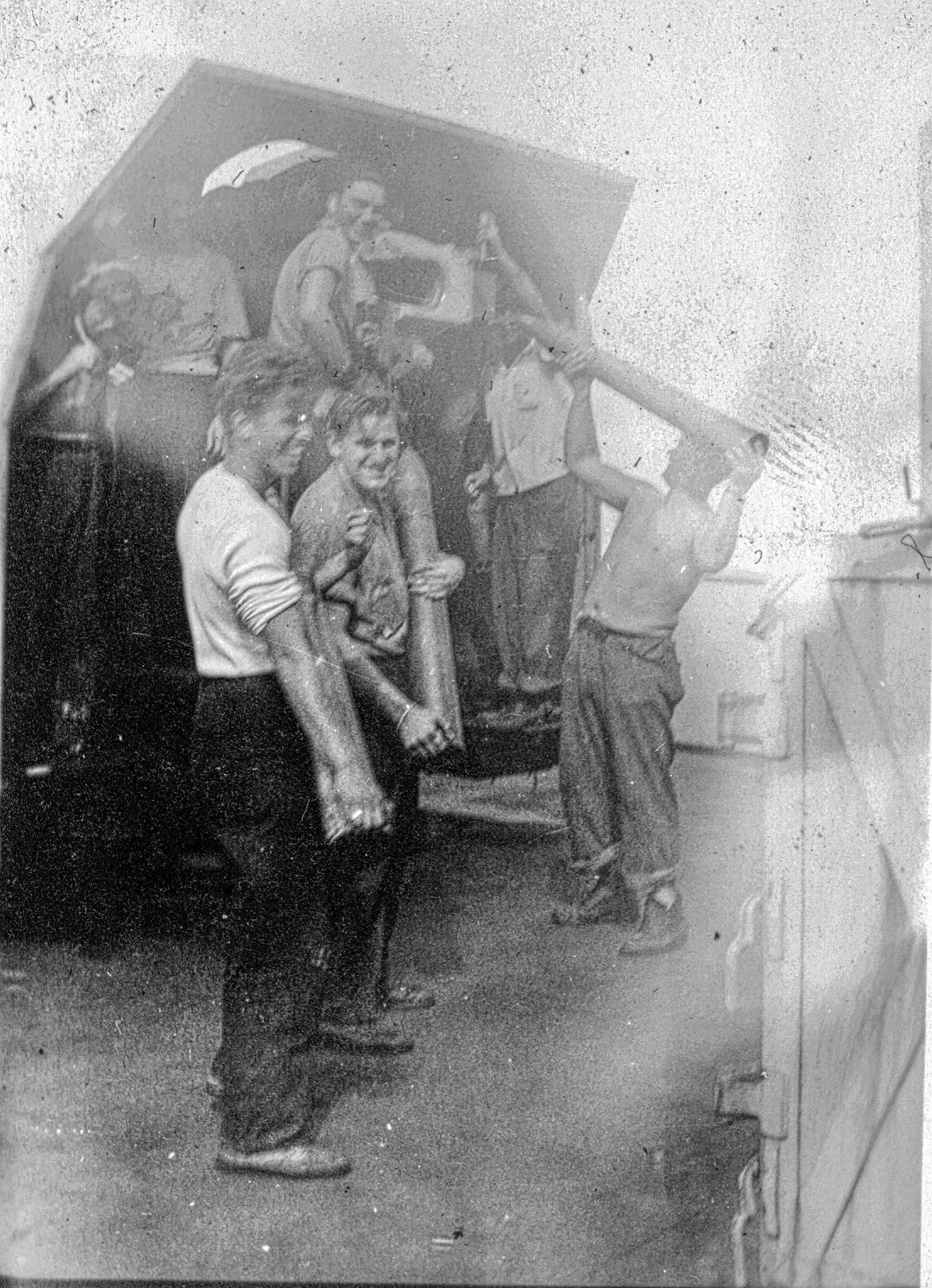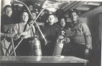 (WD62) Gunshield art on HMCS WALLACEBURG J336 (WD63) Bingo night on HMCS WALLACEBURG J336 (WD64) Fire fighting (training??) aboard HMCS WALLACEBURG J336. The officer in the photo appears to be SLt Jarl Ketola (WD65) Signalmen on the bridge of HMCS WALLACEBURG J336 (WD66) Unknown sailor climbing in/out the quarter deck hatch on HMCS WALLACEBURG J336. Note the convoy on the horizon