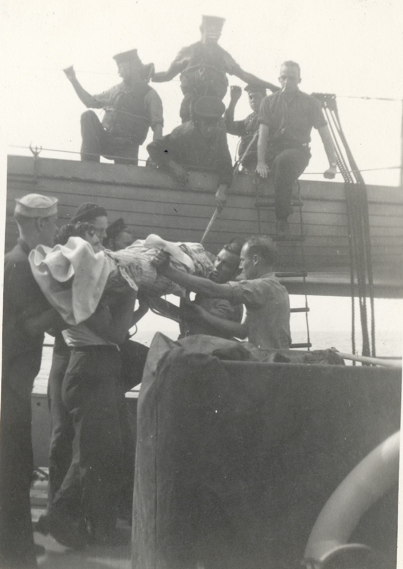 (WD107) Casualty being brought onboard HMCS WALLACEBURG J336