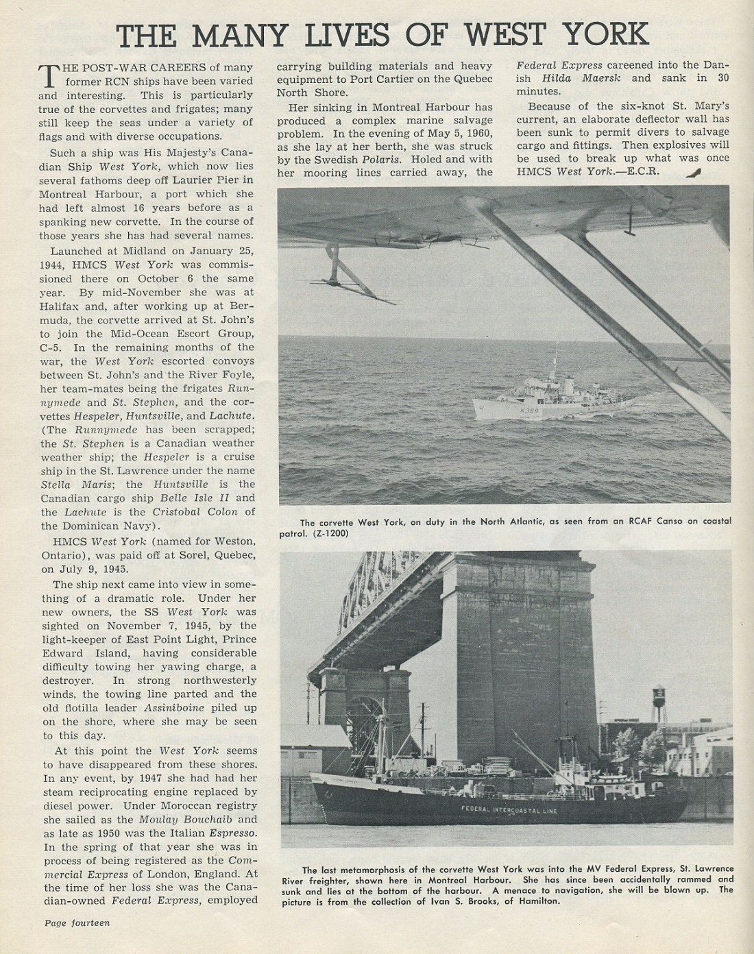 Built by Midland Shipyards, Ltd., Midland, Ont., she was commissioned at Collingwood, Ont., on 06 Oct 1944. West York arrived at Halifax in mid-Nov 1944 and left a month later for Bermuda to work up. In Feb 1945, she joined EG C-5 at St. John's, leaving 16 Feb 1945 to rendezvous with her maiden convoy, HX.338. She made three round trips across the Atlantic before the end of her career, the last one as escort to ON.305, which she joined from Londonderry at the end of May 1945. Paid off on 09 Jul 1945, and laid up at Sorel, she was sold later that year for commercial use. As SS West York, she was towing the former HMCS ASSINIBOINE when the towline parted and the destroyer was wrecked on Prince Edward Island, 07 Nov 1945. The former WEST YORK sailed under a variety of names and flags, returning to Canadian registry in 1960 as Federal Express. On 05 May 1960 she was rammed by Polaris (Swedish vessel) while moored at Montreal. She broke free from her moorings and rammed into Thorshope (Norwegian vessel) and sank within 30 minutes. Later partly raised and scrapped.