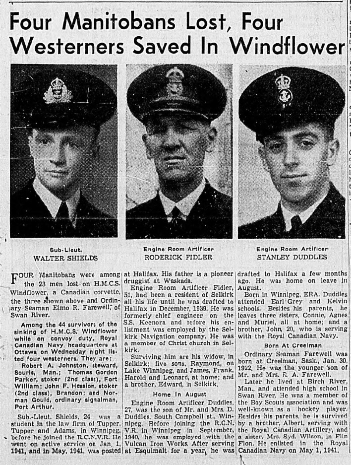(WDF007) Article on HMCS WINDFLOWER casualties and survivors // Toronto Star Dec 1941 (WDF008) Four Manitobans Lost, Four Westerners Saved in Windflower (WDF009) Article on Windflower casualties and survivors // The Toronto Star Dec 1941 // Edward Lockwood is reported in the article as lost, but he survived the sinking (WDF010) Article on 8 Toronto area casualties and survivors from HMCS WINDFLOWER