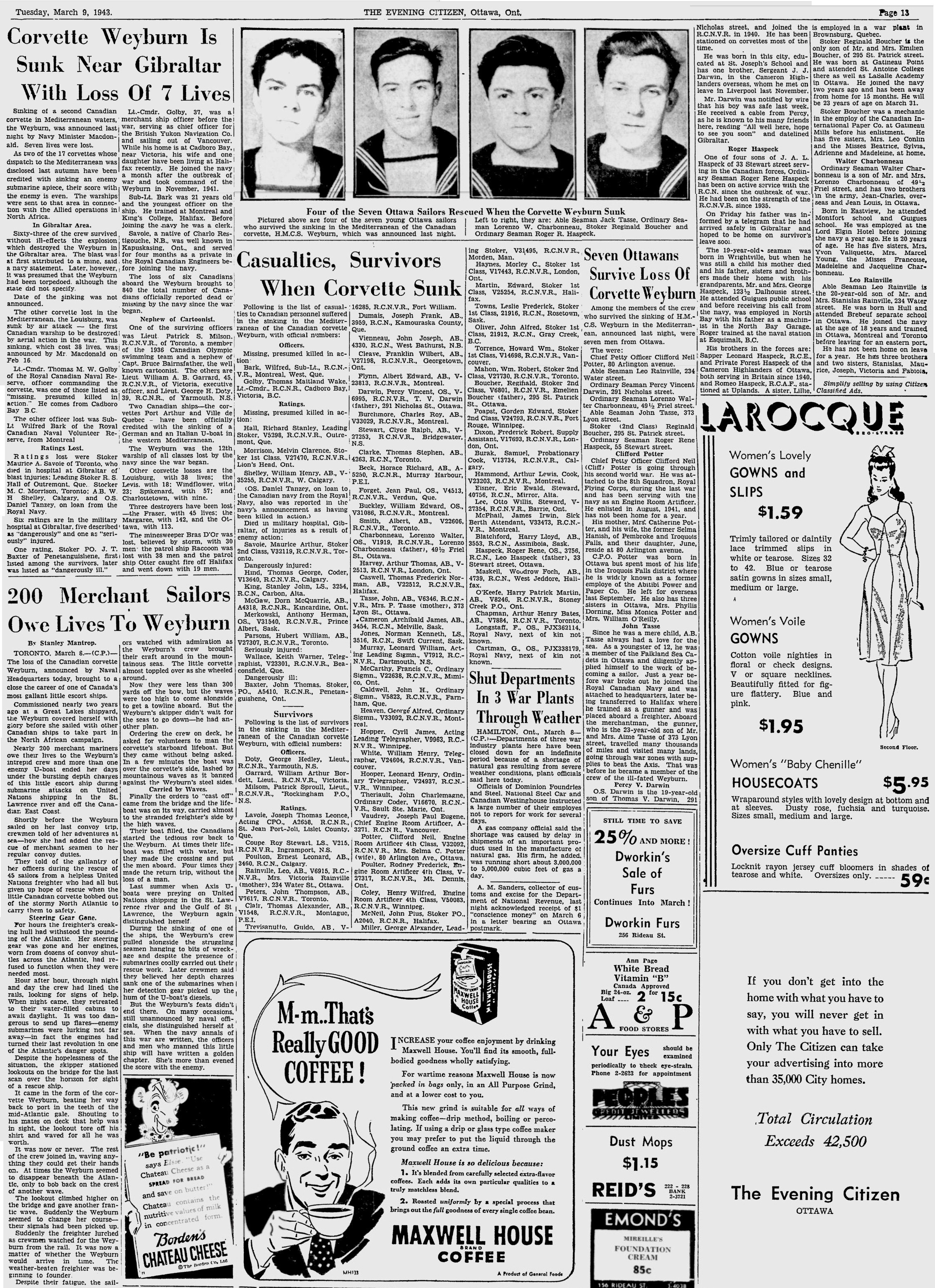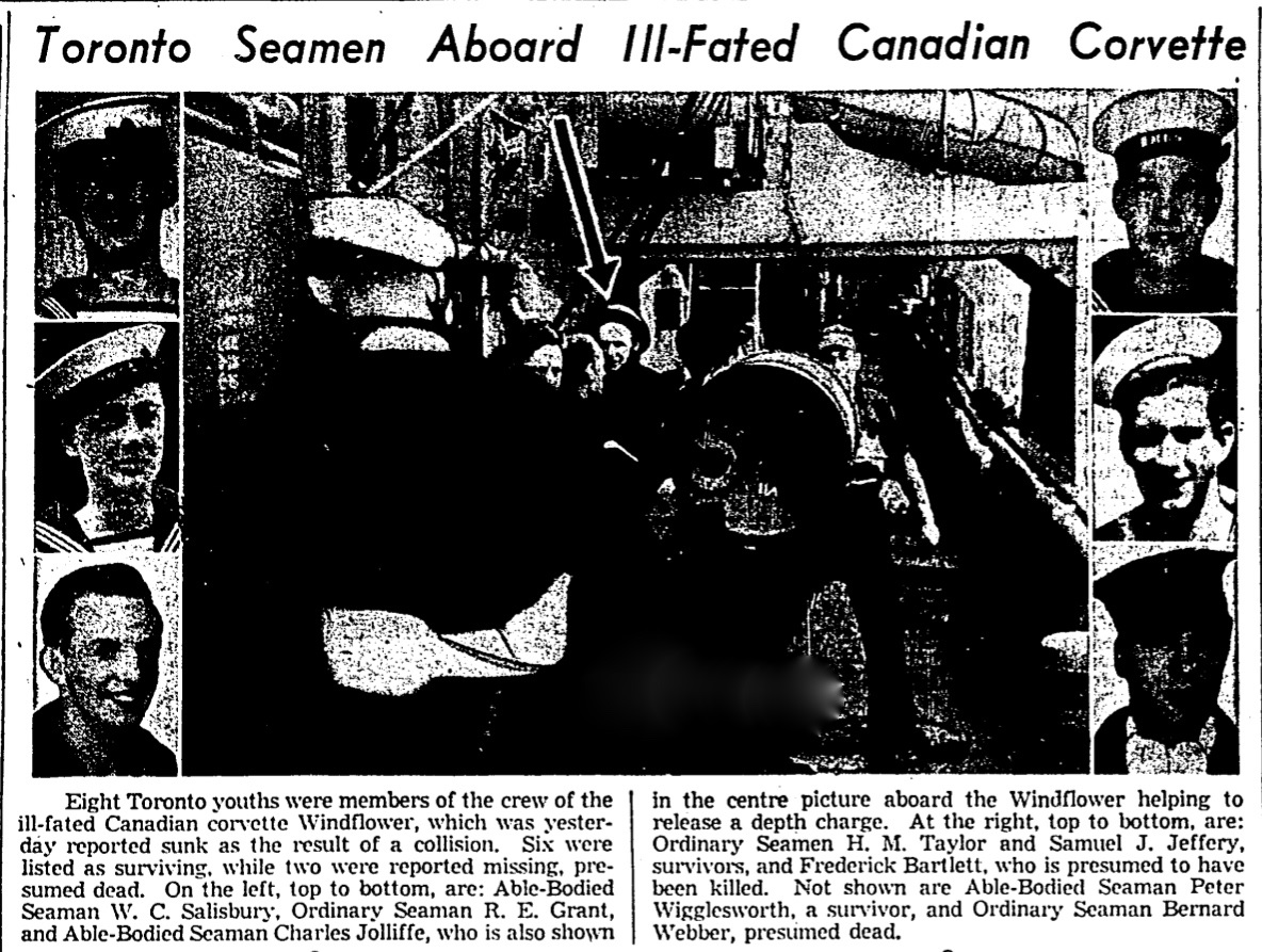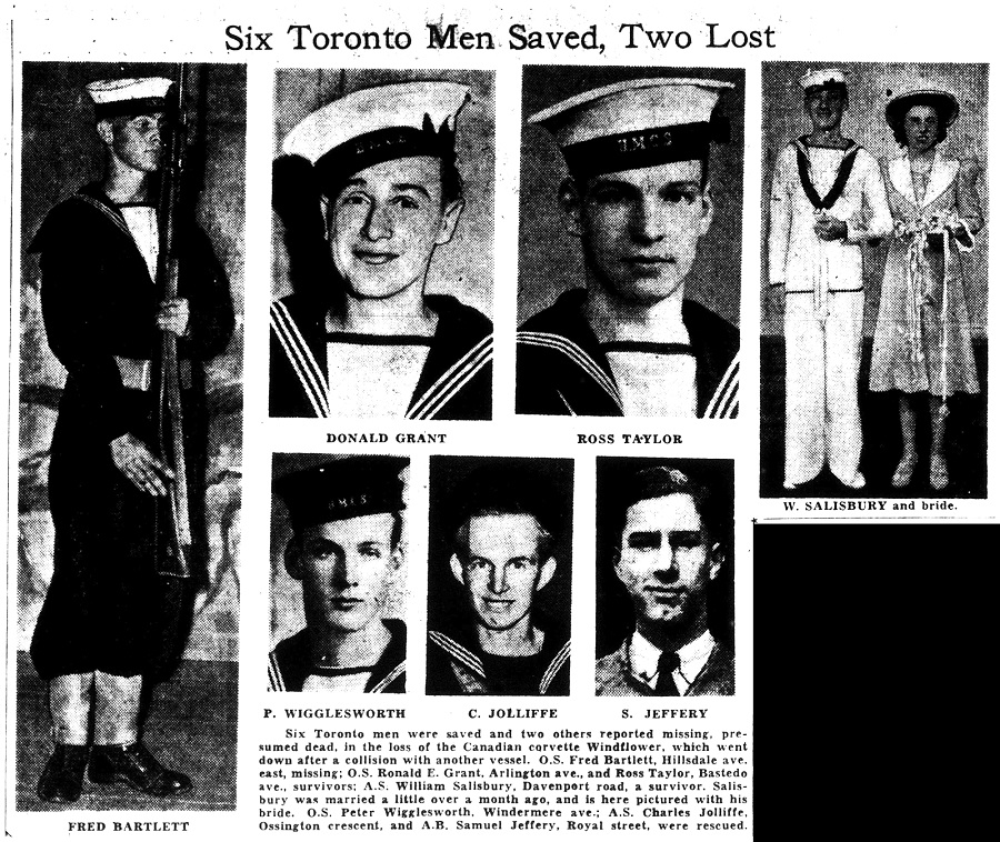 (WDF004) Newspaper article on the sinking of HMCS WINDFLOWER (WDF005) Newspaper articles on the sinking of HMCS WINDFLOWER K155 // The Evening Citizen, Ottawa, Ontario - 09 Mar 1943 (WDF006) Six Toronto Men Save, Two Lost // Toronto Telegram Dec 1941 // Article on HMCS WINDFLOWER casualties and survivors