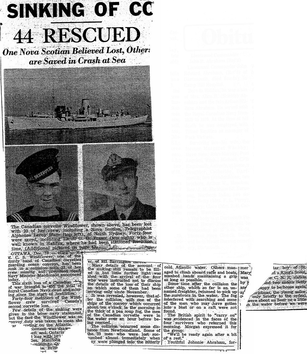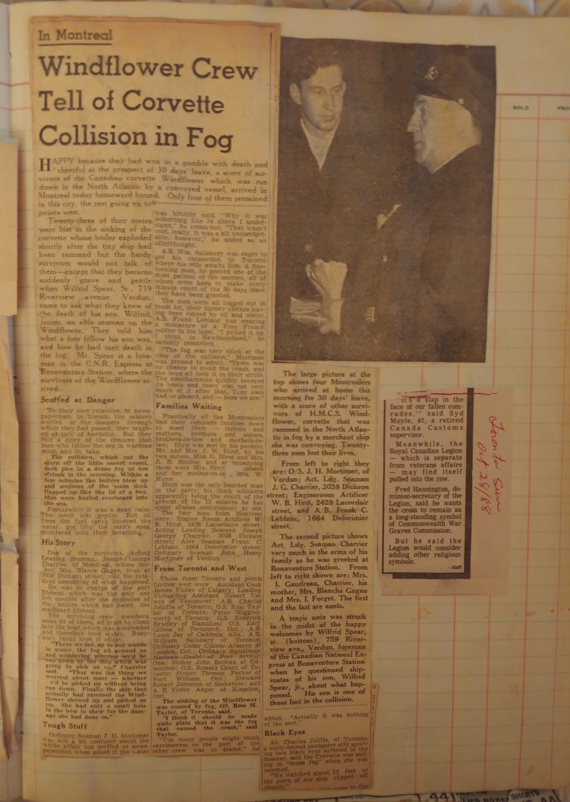 (WR09-WR10) Articles on the sinking of HMCS WINDFLOWER K155 From the collection of Walter Richardson, RCNVR Courtesy of Shawn Richardson