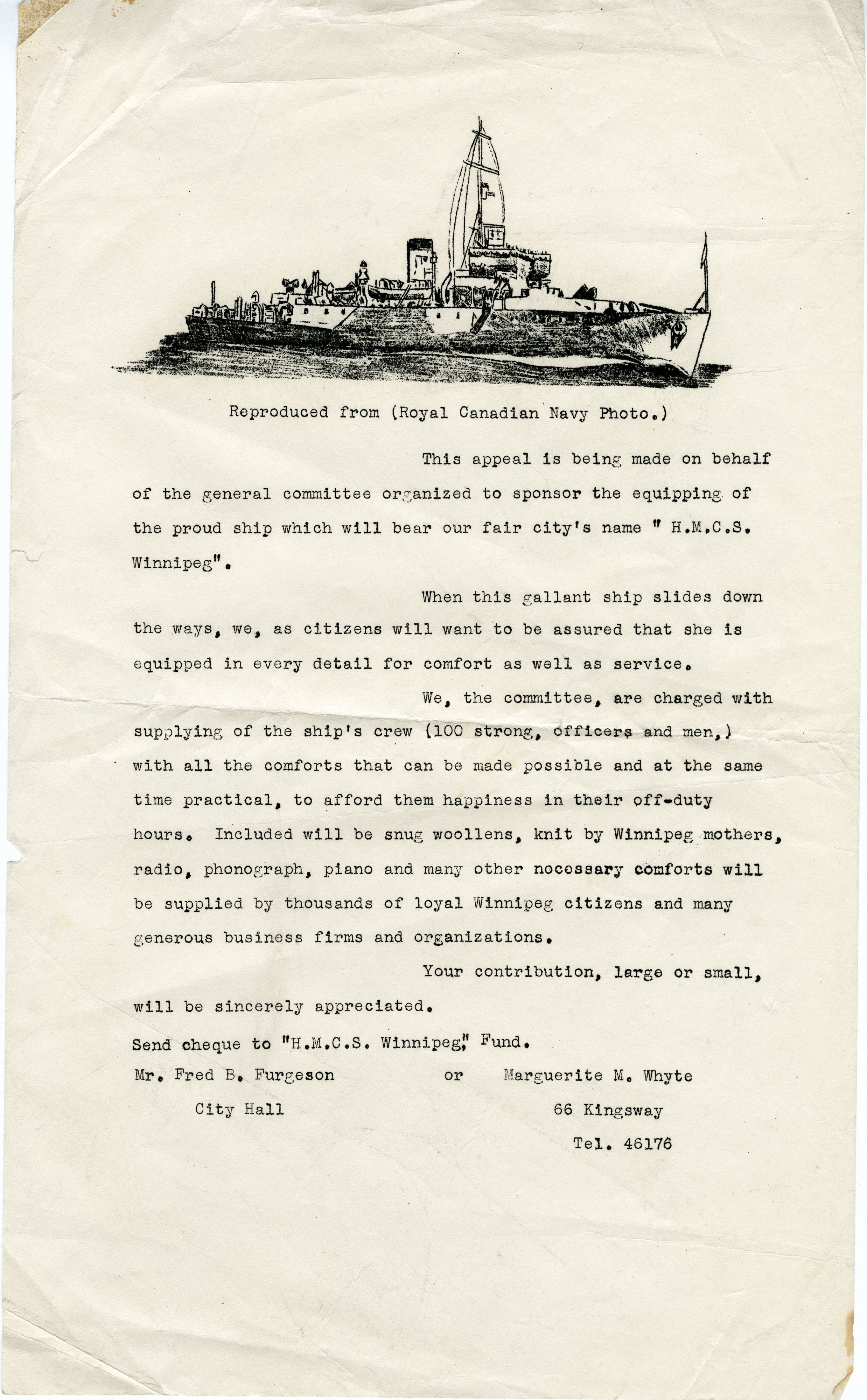 (WNI-NMoM001) Appeal for donations to fund comfort items for HMCS WINNIPEG J337 (WNI-NMoM002) Programme of Christening and Commissioning HMCS WINNIPEG J337