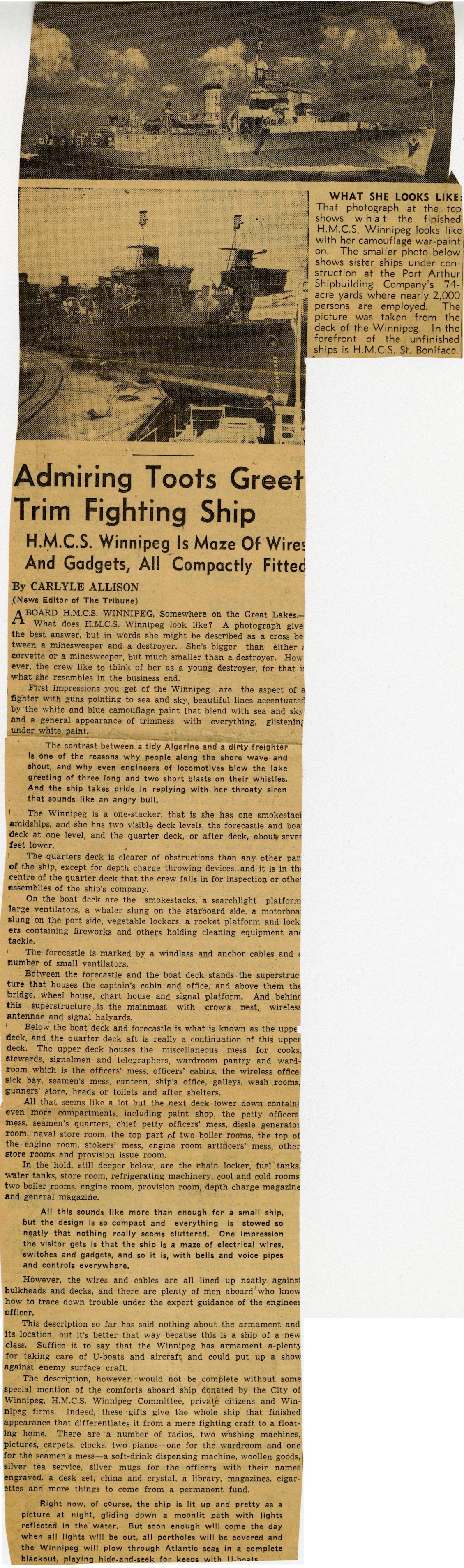 (WNI001) HMCS WINNIPEG - Biggest Naval Vessel Built on the Great Lakes // The Winnipeg Evening Tribune 14 Apr 1943 (WNI002) Down Great Lakes On HMCS WINNIPEG // The Winnipeg Evening Tribune 09 Aug 1943 (WNI003) HMCS WINNIPEG Knows The Meaning Of The Words "Merry Christmas" // Crow's Nest newspaper - Dec 1943 (WNI004) Sailors in the seaman's mess on HMCS WINNIPEG J337 // Source: The Military Museums of Calgary // Courtesy of Chris Skilling (WNI005) Memories of HMCS WINNIPEG J337 by R.A. Judges, LCdr, RCNVR // Article from an 85th Anniversary of the RCN souvenir magazine