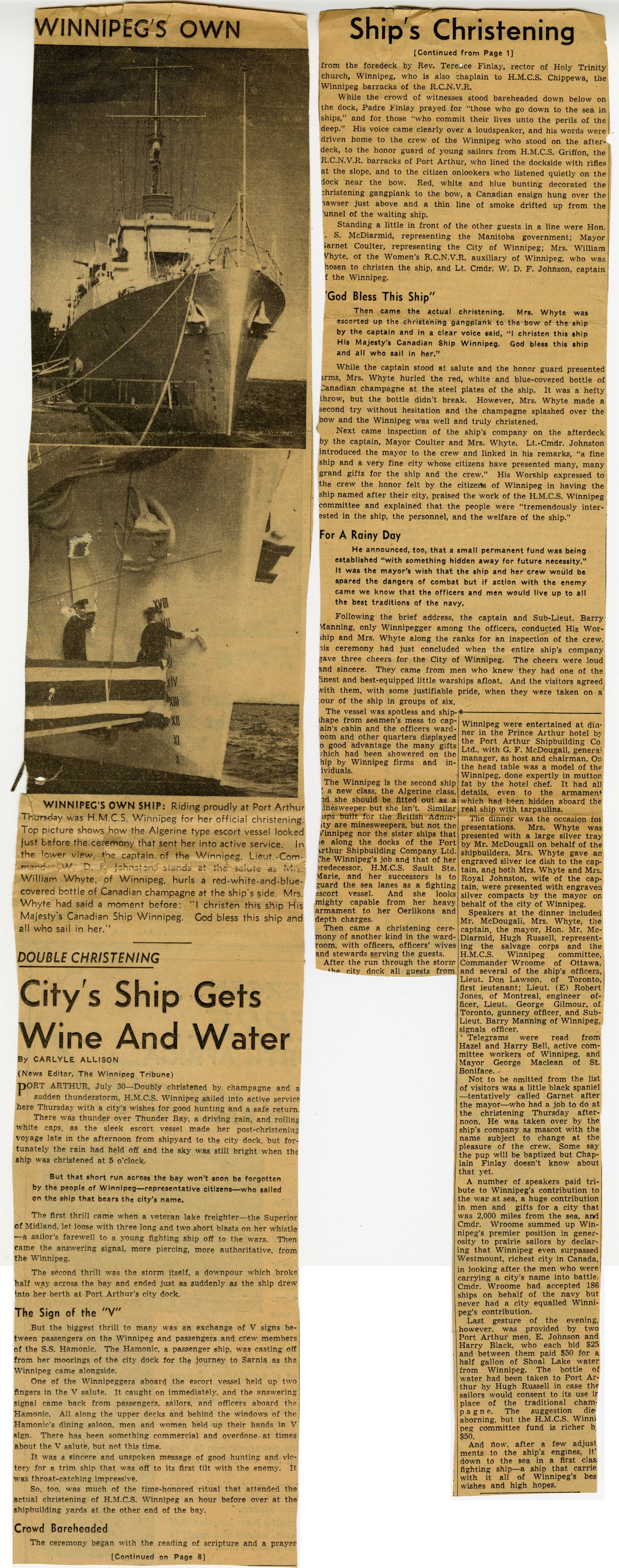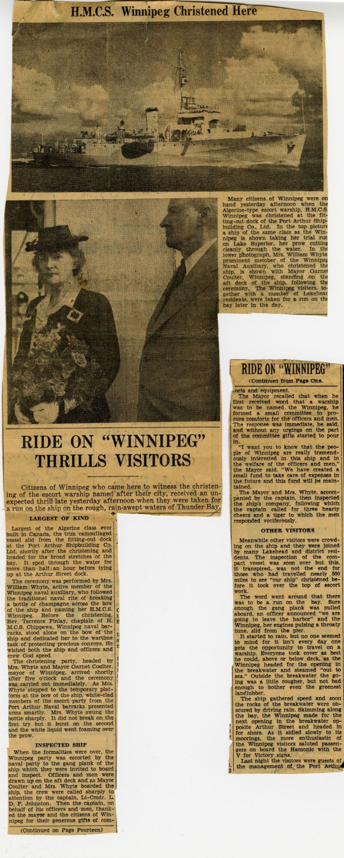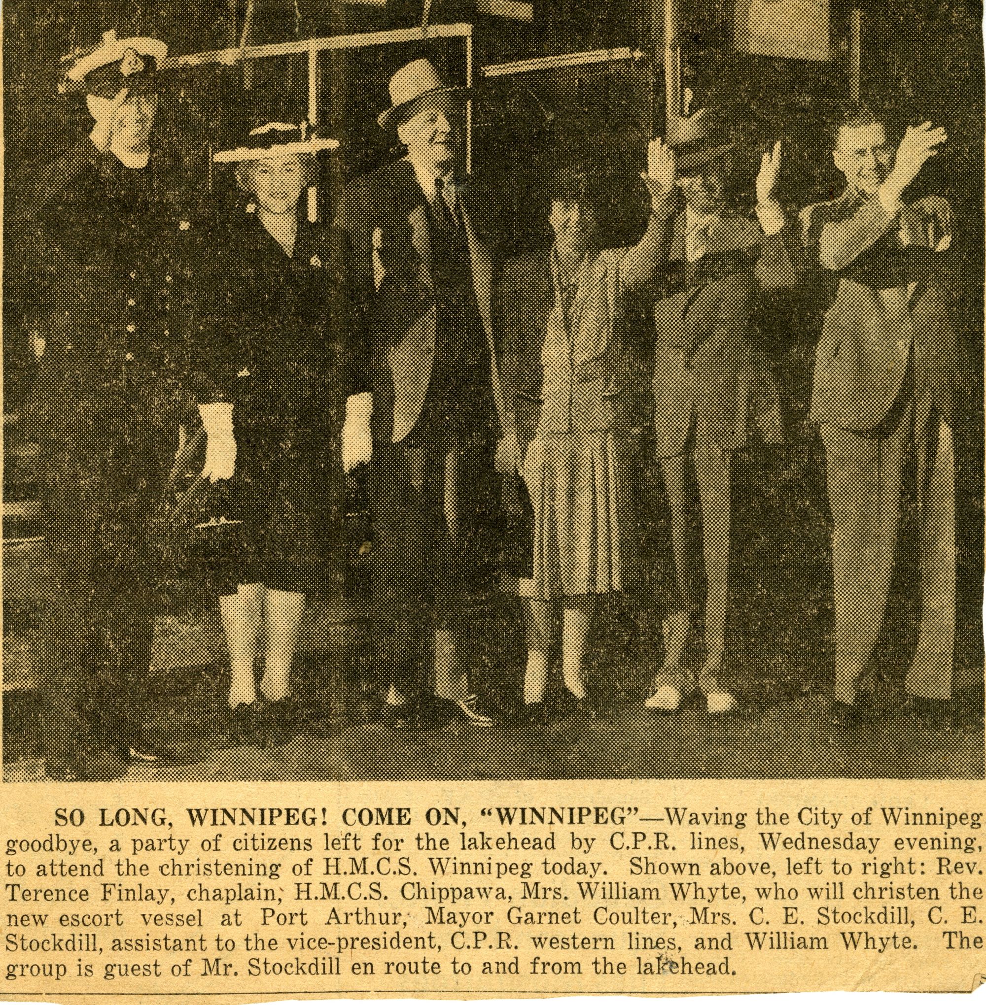(WNI-NMoM018) Unfortunately Mr. Mayor Lacked A Wife (WNI-NMoM019) Mayor Launches Fund For Adopted Minesweeper (WNI-NMoM020) Minesweeper Fund At $607 (WNI-NMoM021) LCdr W. D. F. Johnston on special assignment - no longer in command of HMCS WINNIPEG (WNI-NMoM022) Ride on "WINNIPEG" Thrills Visitors
