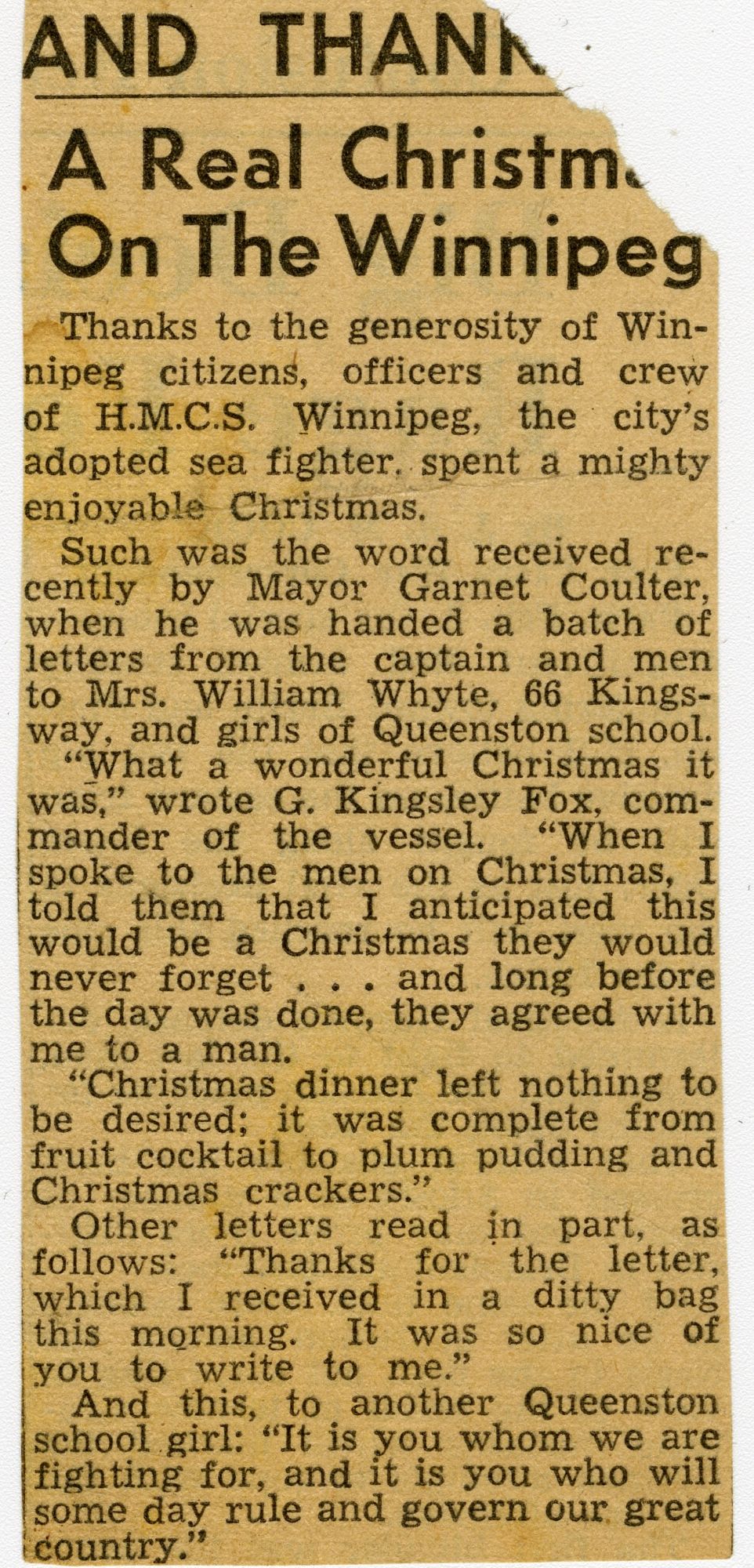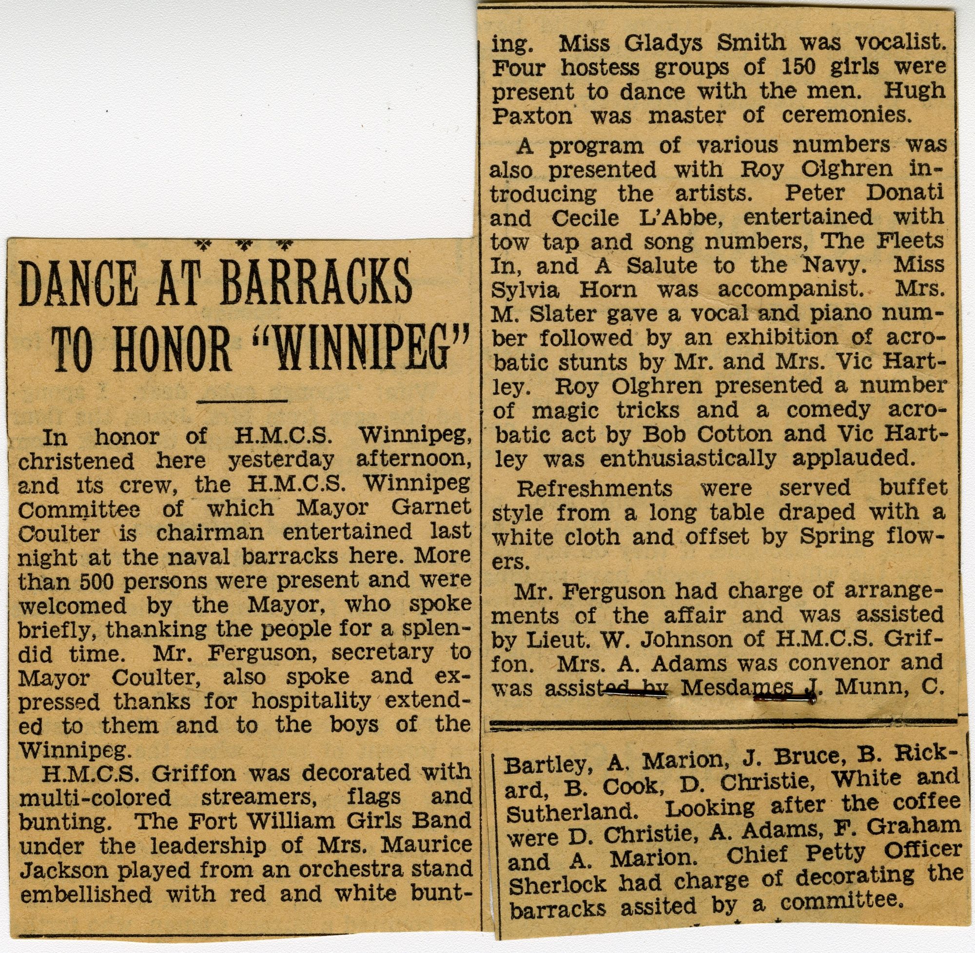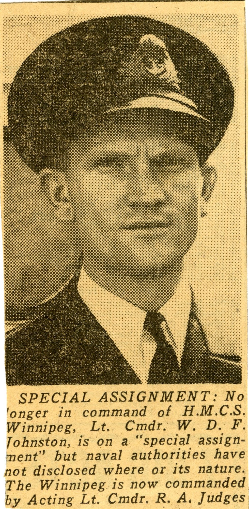 (WNI-NMoM018) Unfortunately Mr. Mayor Lacked A Wife (WNI-NMoM019) Mayor Launches Fund For Adopted Minesweeper (WNI-NMoM020) Minesweeper Fund At $607 (WNI-NMoM021) LCdr W. D. F. Johnston on special assignment - no longer in command of HMCS WINNIPEG (WNI-NMoM022) Ride on "WINNIPEG" Thrills Visitors