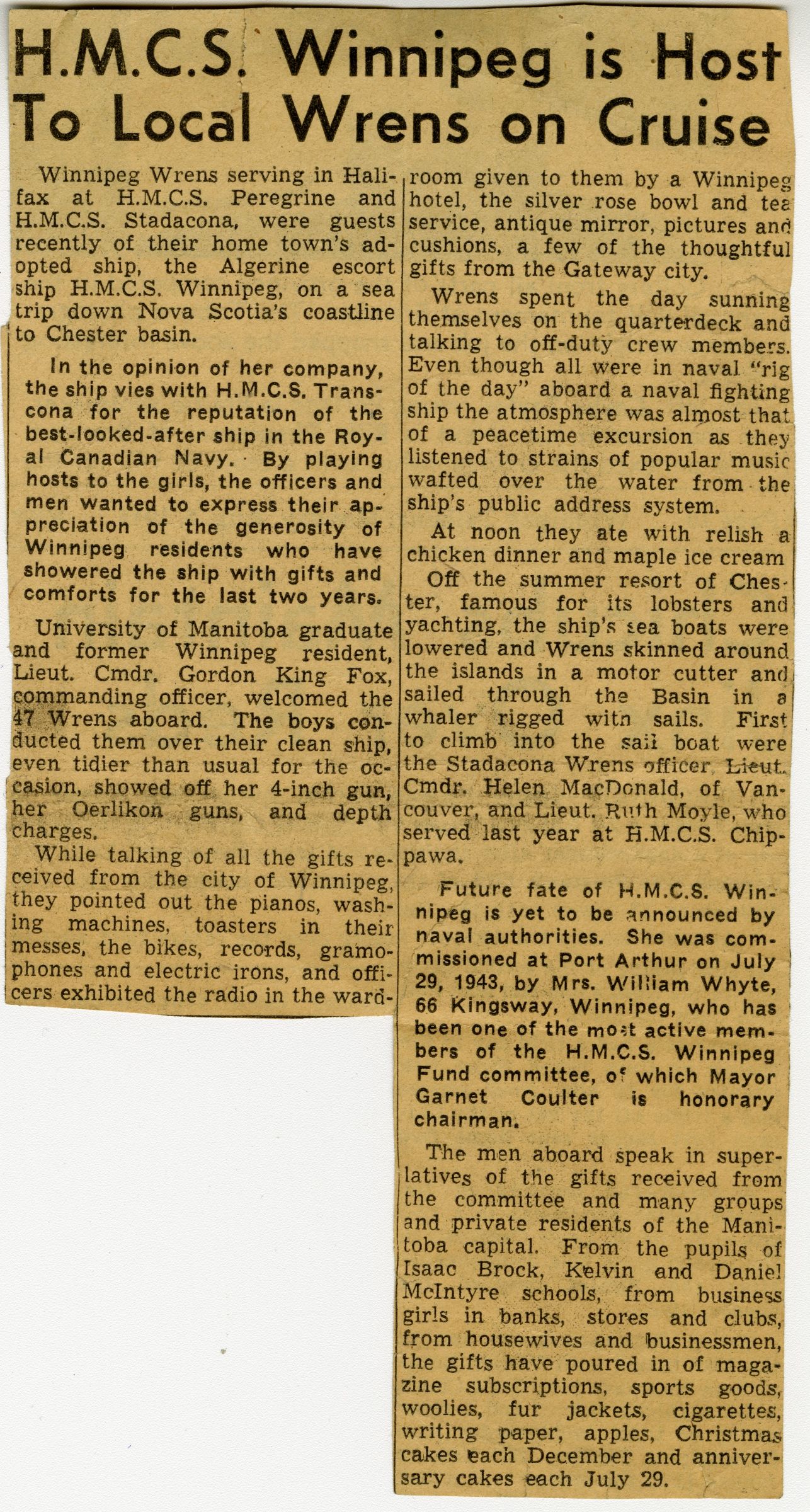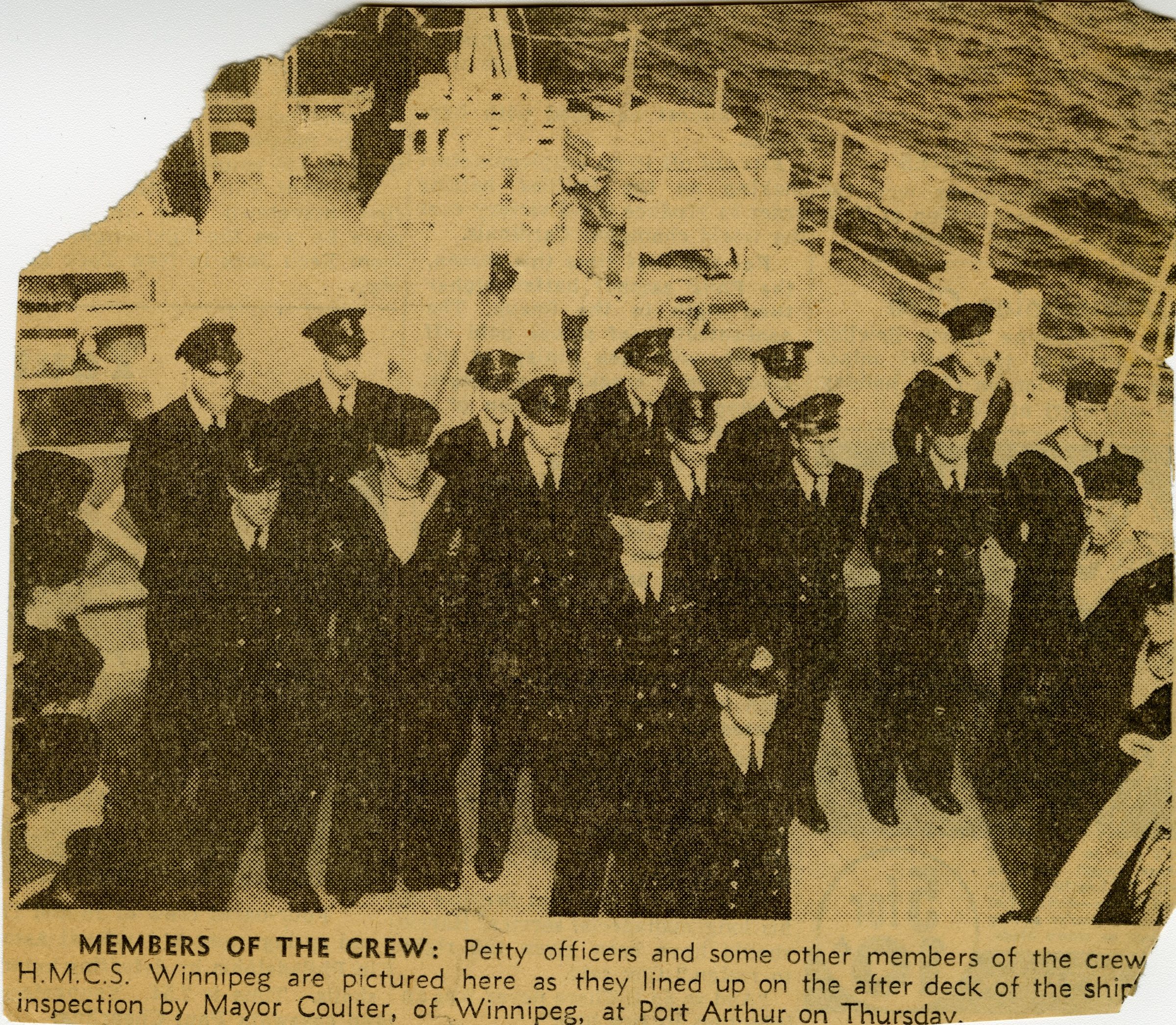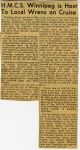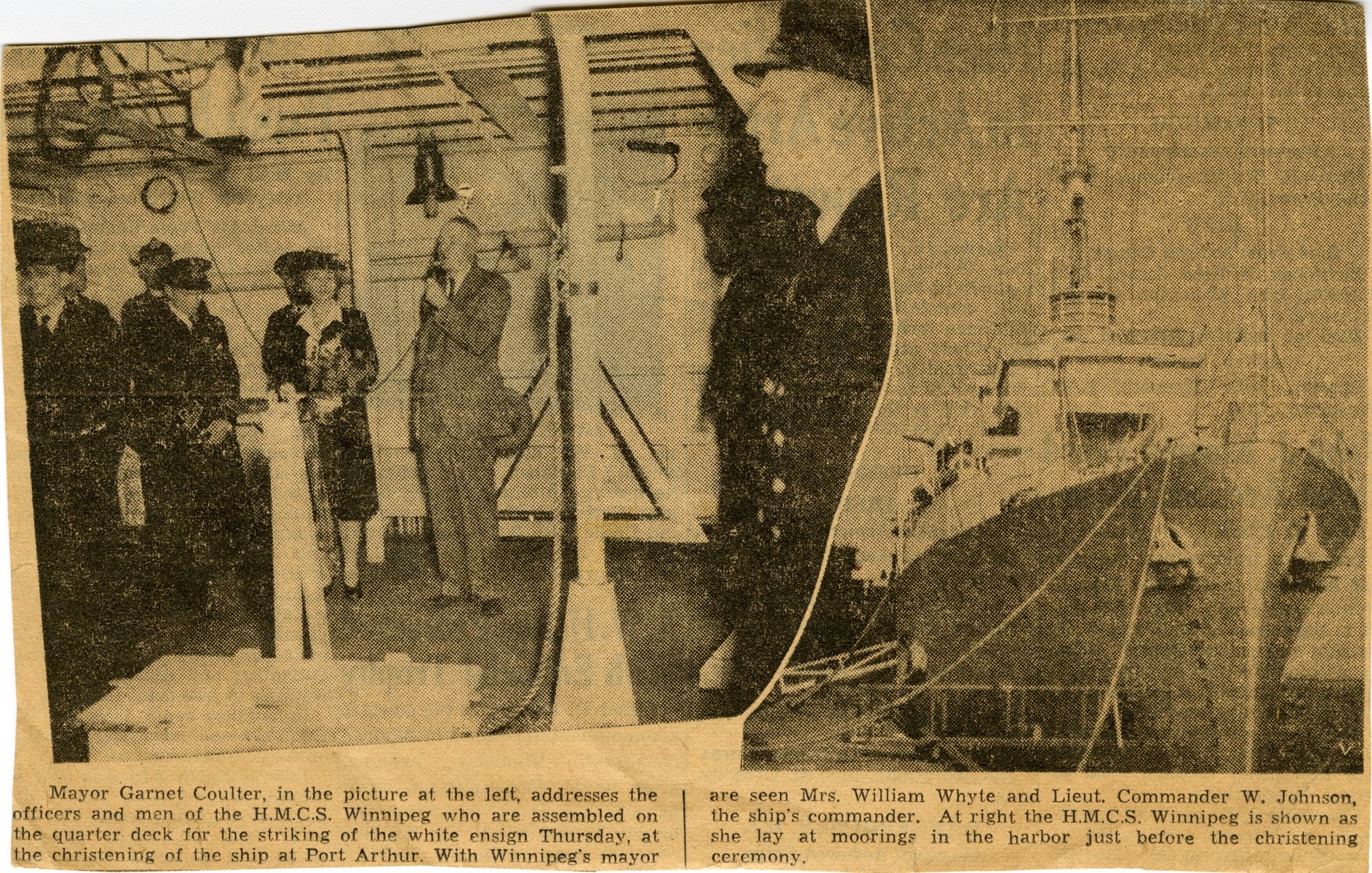 (WNI-NMoM028) Mayor Coulter of Winnipeg inspects ship's company (WNI-NMoM029) Sailors Need Fur Jackets, 21 Apr 1943, The Morden Times (WNI-NMoM030) Flaw in Escort Ship's Four-inch Gun Ironed Out in Lake Ontario Test (WNI-NMoM031) HMCS WINNIPEG conducts gun trials on Lake Ontario (WNI-NMoM032) Christmas Cake for WINNIPEG