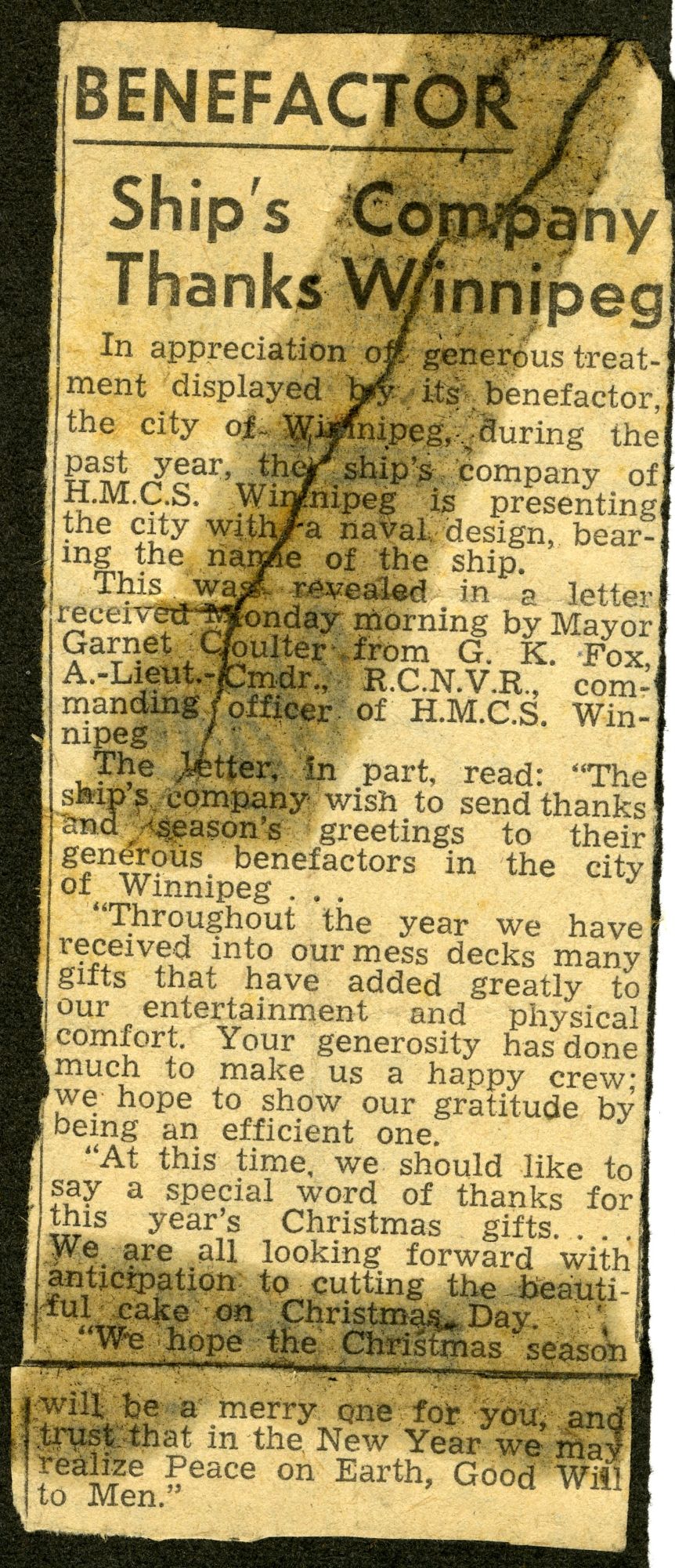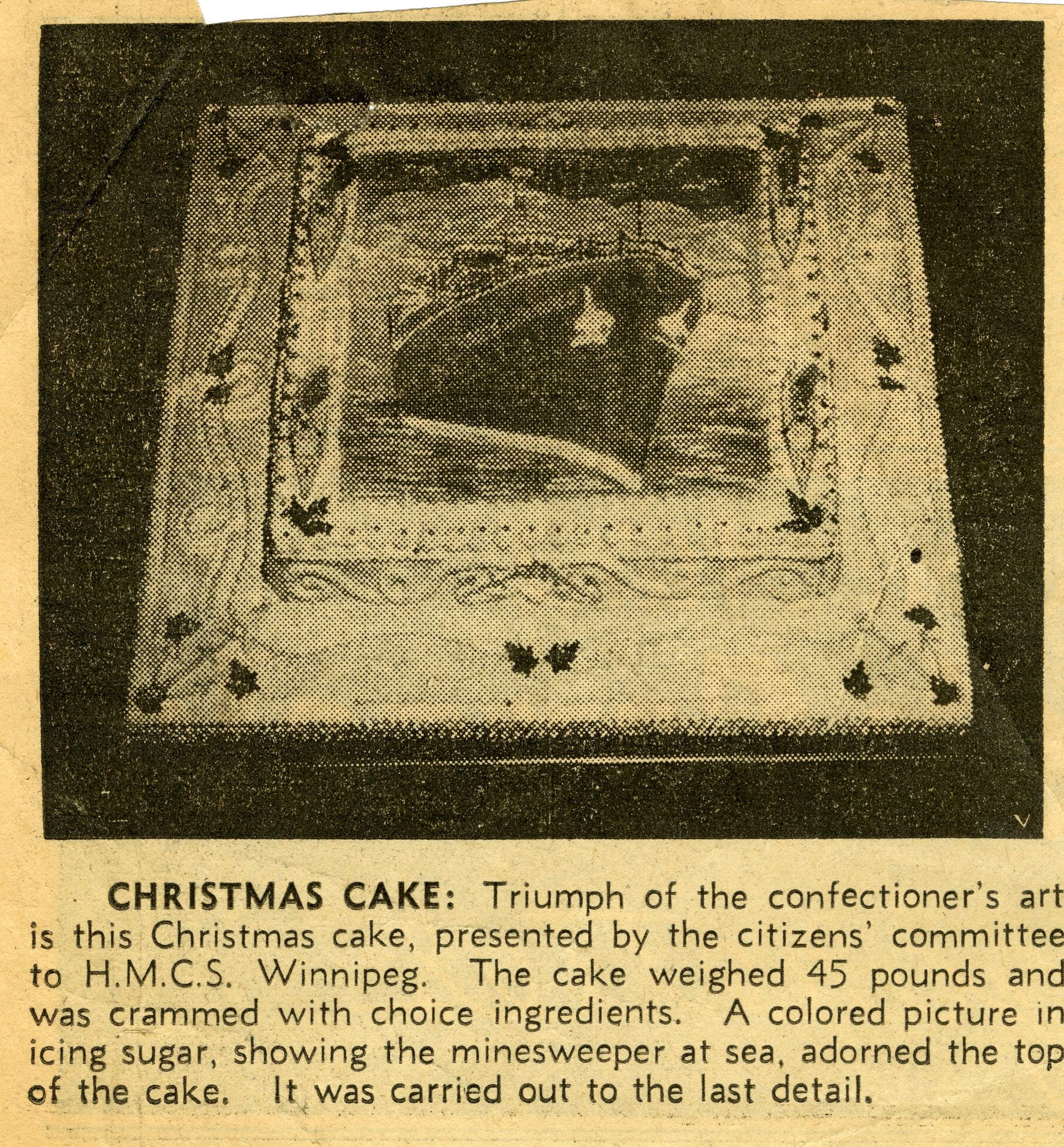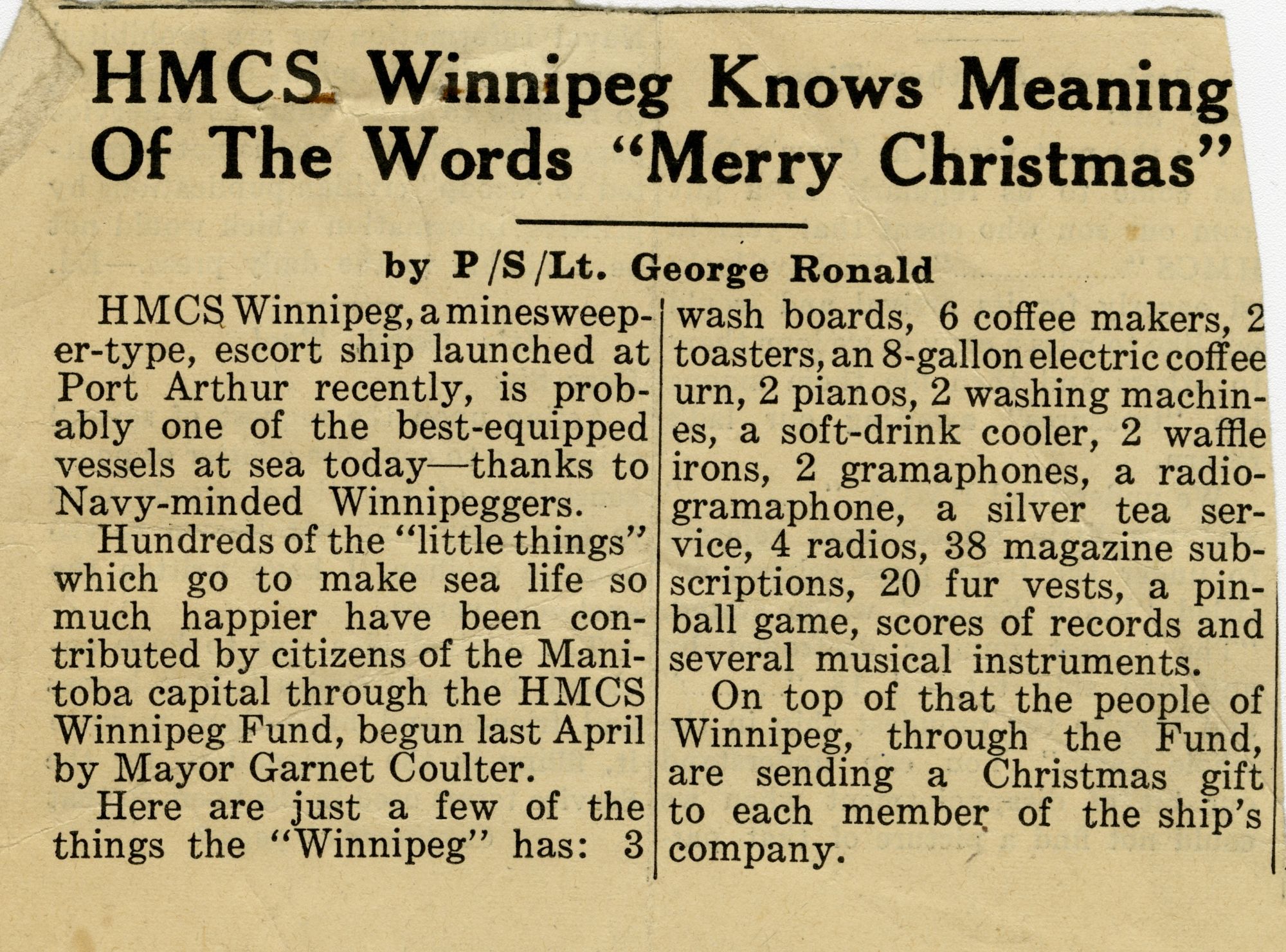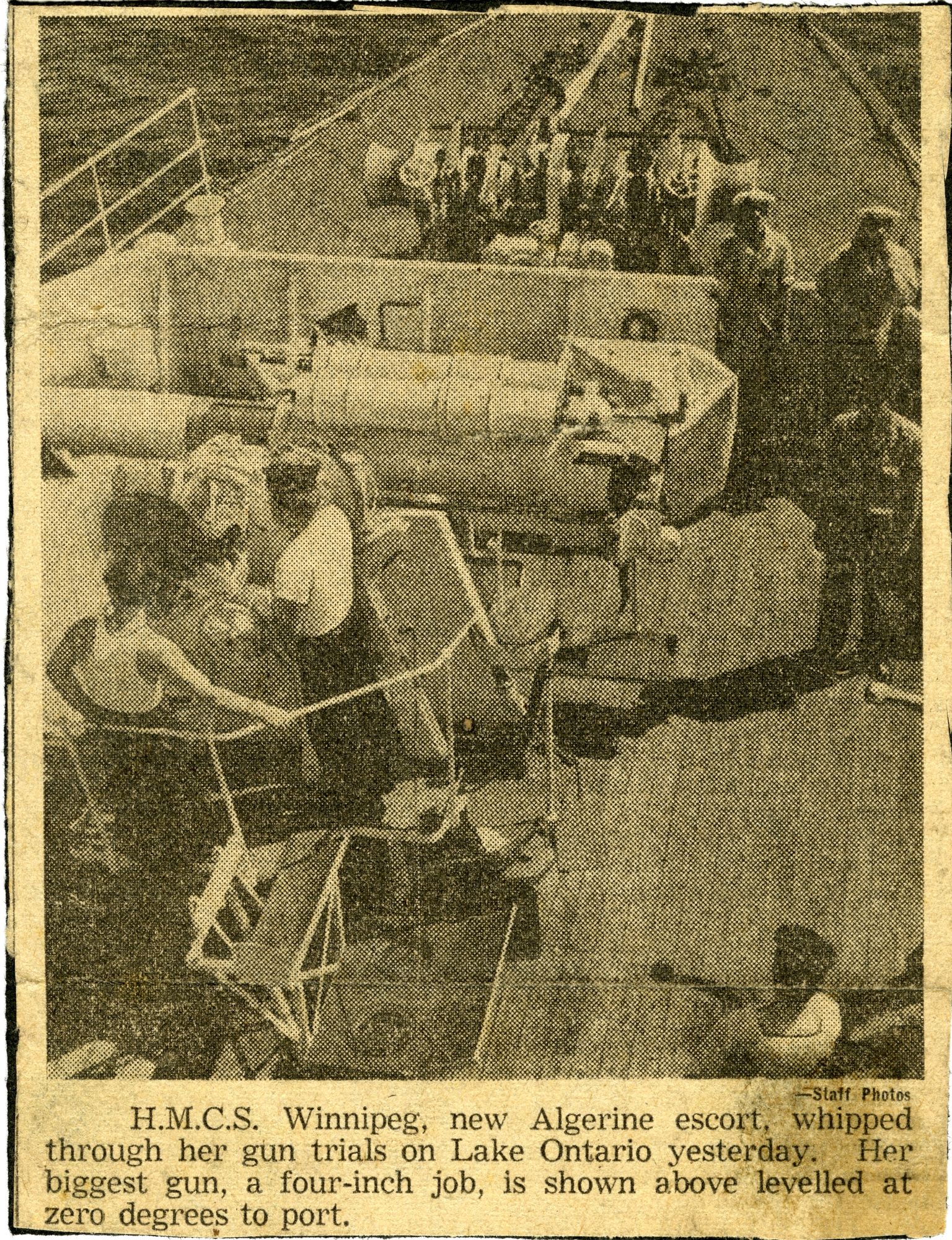 (WNI-NMoM028) Mayor Coulter of Winnipeg inspects ship's company (WNI-NMoM029) Sailors Need Fur Jackets, 21 Apr 1943, The Morden Times (WNI-NMoM030) Flaw in Escort Ship's Four-inch Gun Ironed Out in Lake Ontario Test (WNI-NMoM031) HMCS WINNIPEG conducts gun trials on Lake Ontario (WNI-NMoM032) Christmas Cake for WINNIPEG