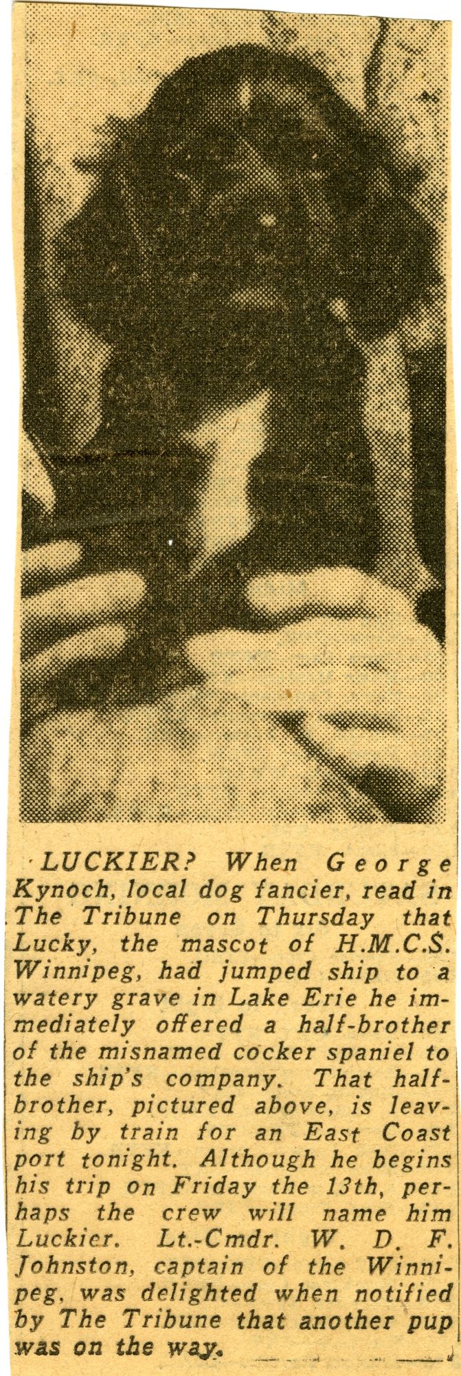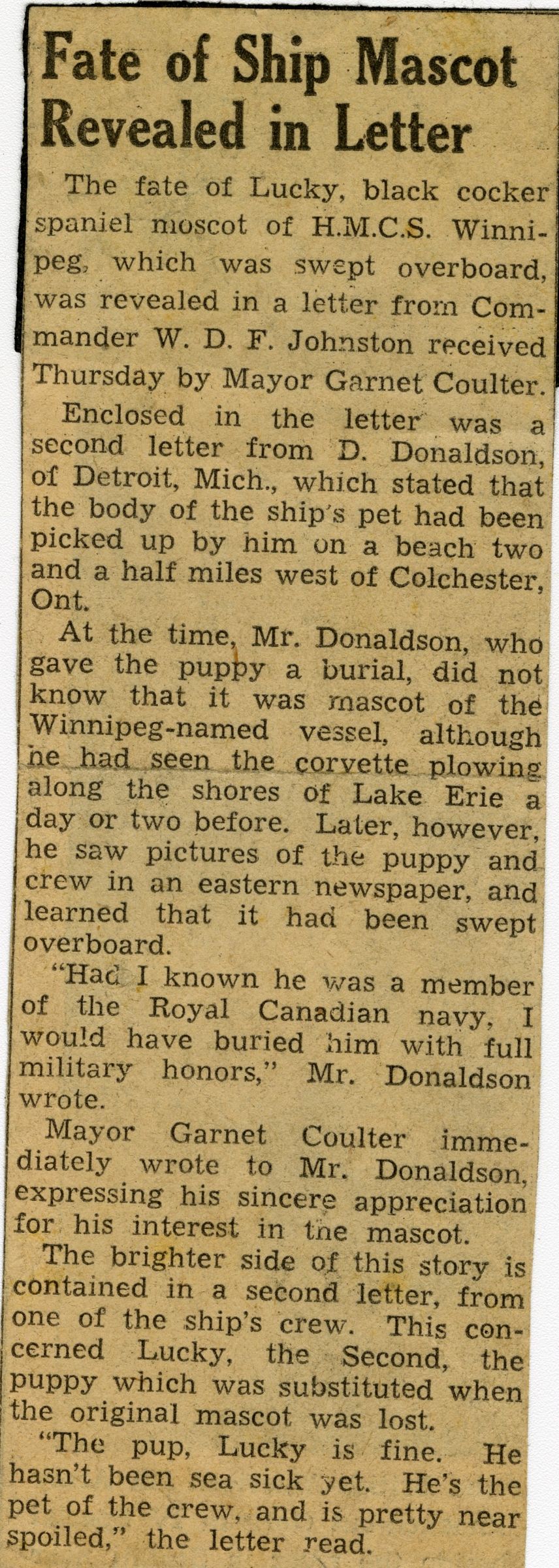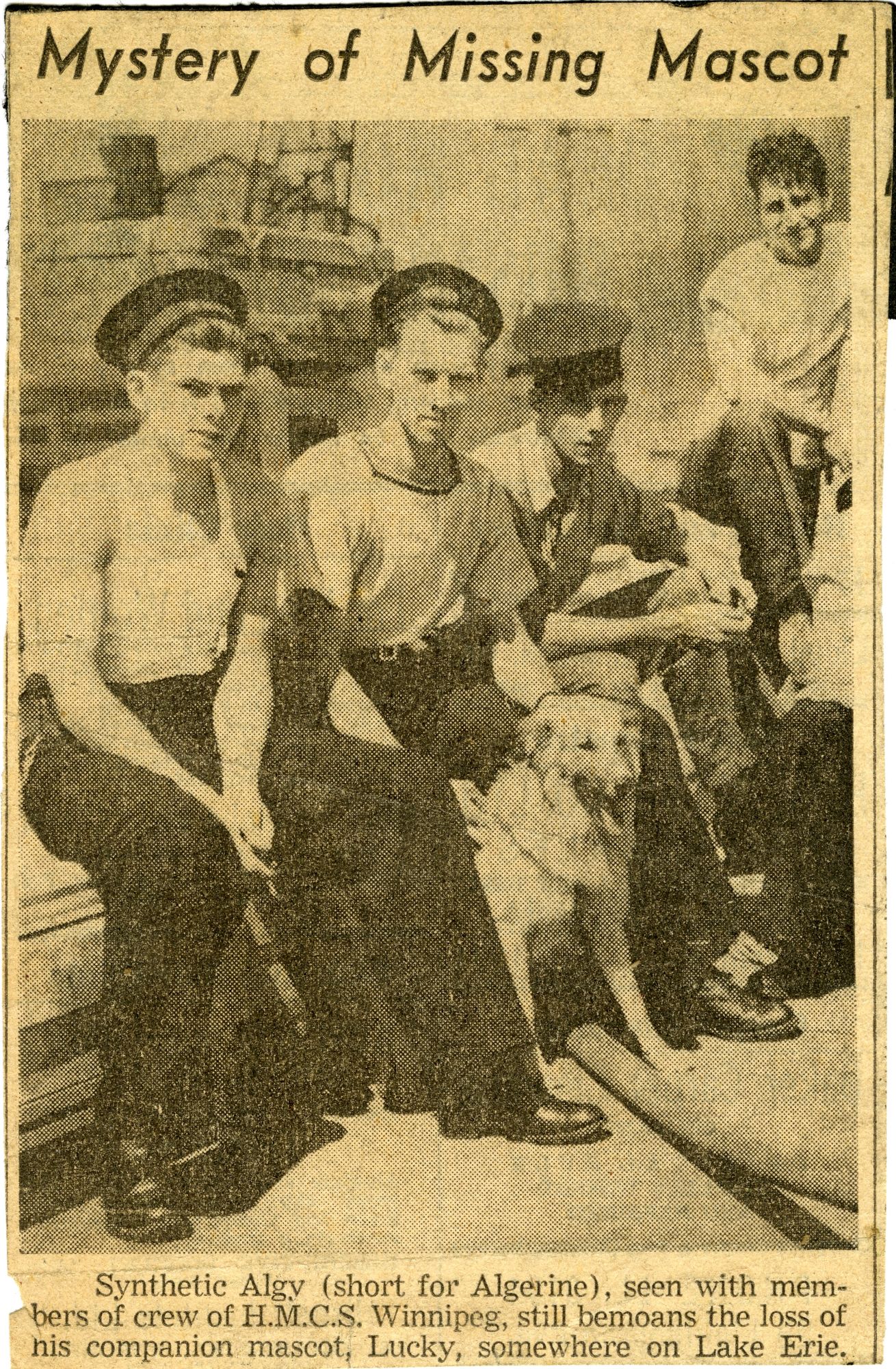 (WNI-NMoM008) HMCS WINNIPEG'S mascot Lucky missing believed drowned in Lake Erie (WNI-NMoM009) Algy, ship's mascot of HMCS WINNIPEG bemoans the loss of his companion mascot, Lucky, lost on Lake Erie (WNI-NMoM010) Fate of Ship Mascot Revealed in a letter (WNI-NMoM011) Luckier, half-brother of Lucky, becomes new ship's mascot for HMCS WINNIPEG (WNI-NMoM012) Mascot of Winnipeg Is Listed as Missing