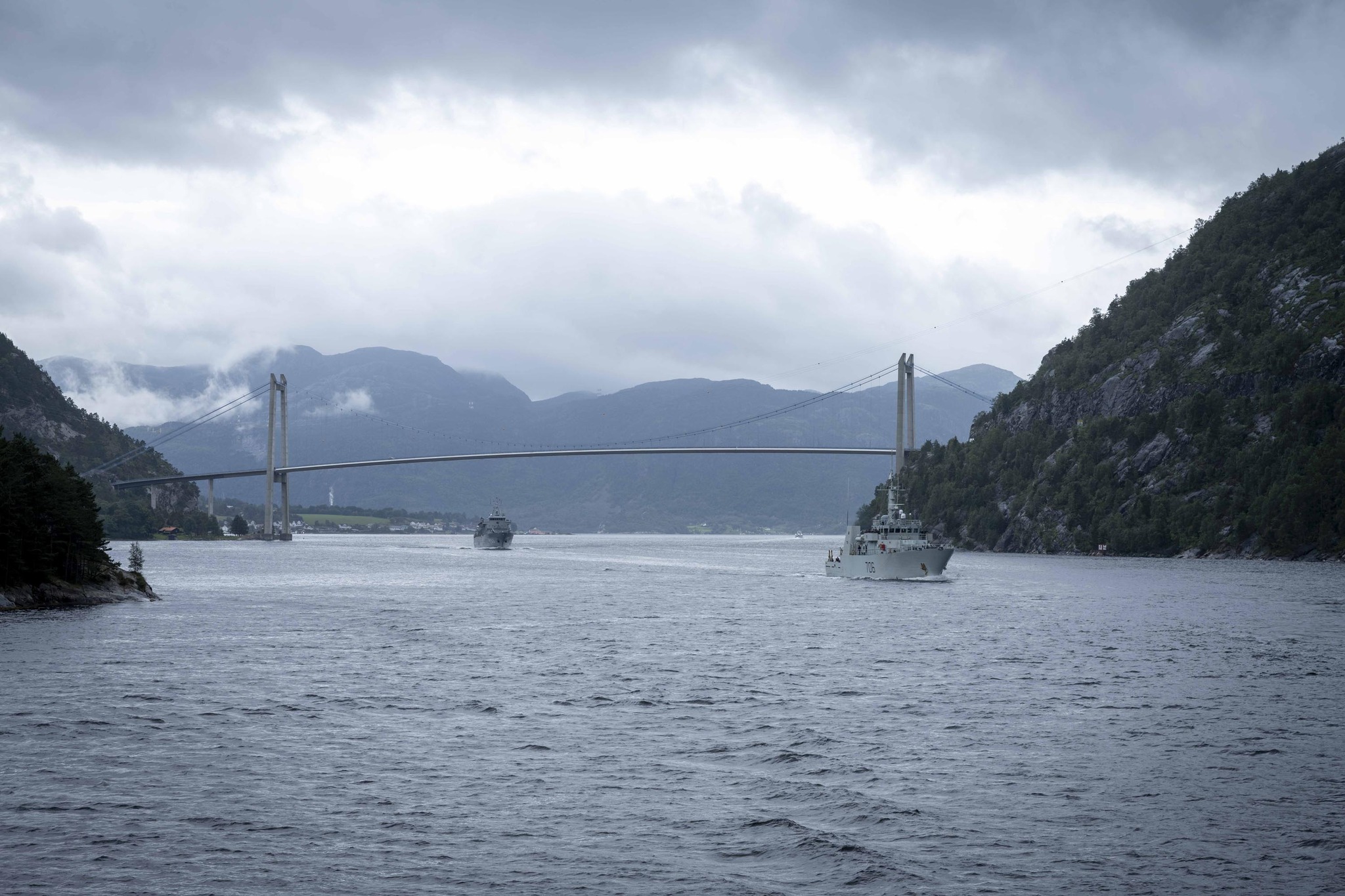 HMCS YELLOWKNIFE 706 and LVNS VIRSAITIS sails through Norwegian Fjords, Norway on 11 August 2025