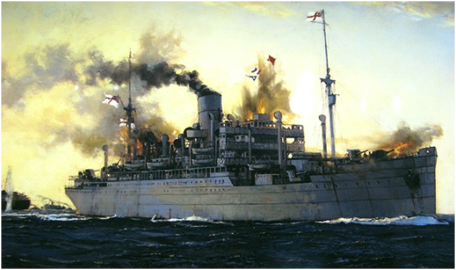 HMS Jervis Bay (F40) Armed Merchant Cruiser, built by Vickers Ltd. (Barrow-in-Furness, U.K.). Commissioned Oct. 15, 1939.Lost Nov. 05, 1940 at position 53.41N, 32.17W.On November 05, 1940, H.M.S. Jervis Bay (A/Capt. Edward Stephen Fogarty Fegen, R.N.) was shelled and sunk in position 52º41'N, 32º17'W by the German pocket-battleship Admiral Scheer while engaging the superior enemy ship in a heroic, if hopeless, fight to give the 37 merchants in the convoy HX-84 a chance to escape, because the armed merchant cruiser was the sole escort. Her sacrifice allowed many ships of the convoy to scatter and escape in the night. Capt. E.S.F. Fegen (R.N.) was posthumously awarded the Victoria Cross, 190 men were lost, while 65 survivors were picked up by the Swedish merchant Stureholm that had turned back during the night to search for survivors.