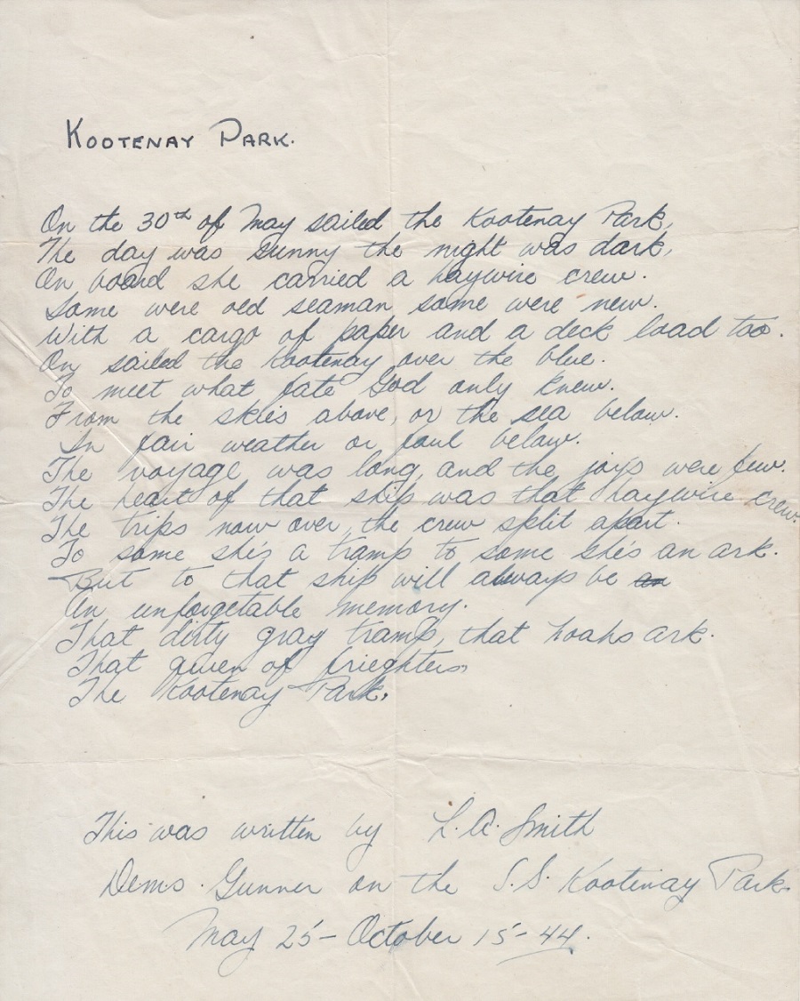 Poem about the SS Kootenay Park written by DEMS Gunner L.A. Smith