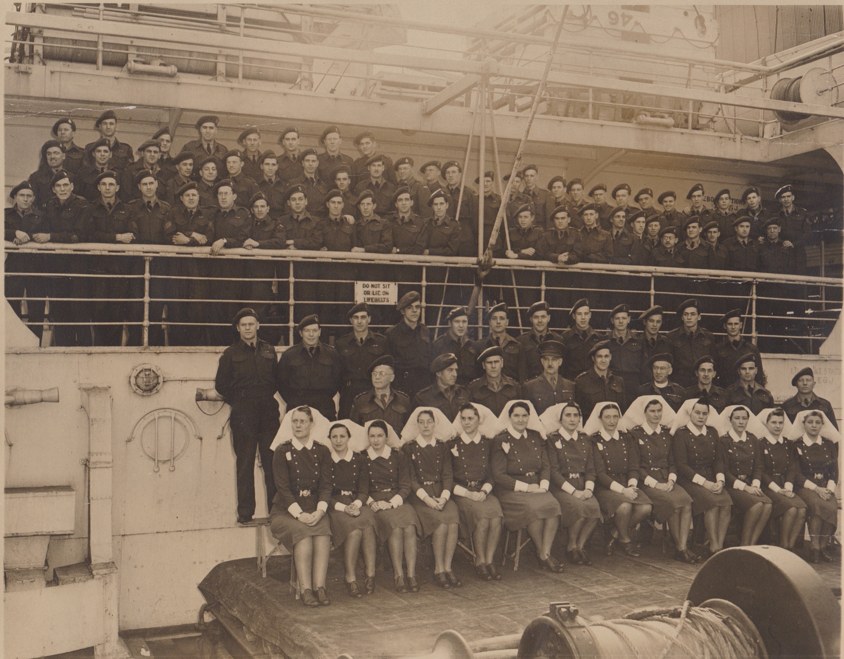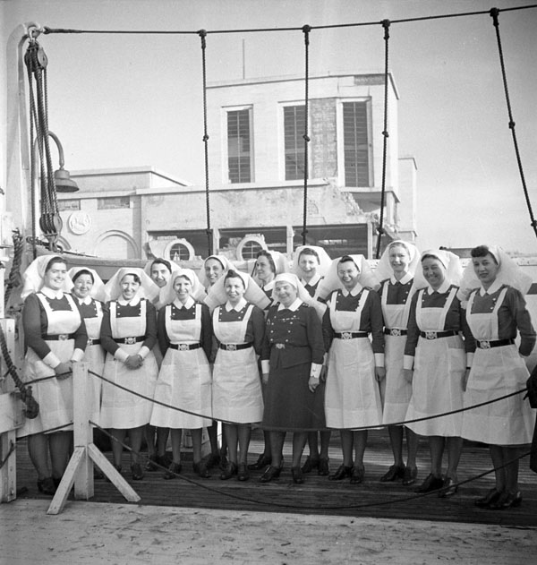 (LDN005) Nursing sisters of the Royal Canadian Army Medical Corps (R.C.A.M.C.) aboard the hospital ship LADY NELSON, Naples, Italy, 29 January 1944. Nursing Sisters R. MacLennan, J. Goodston, Reta Moffat, E. Covey, D.E. MacTier, E. Bateman, Y. Carr, J. Jackson, Captain C.I. Nixon (Matron), M. McLeod, R. Hughes, H.J. Battram, E.K. Sutherland and M.B. Meisner. Credit: Lieut. Frederick G. Whitcombe / Canada. Dept. of National Defence / Library and Archives Canada / PA-163661