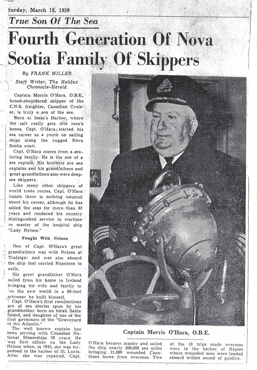 (LDN001) Hospital Ship Lady Nelson // From the collection of Roy Cardy // Courtesy of Dennis Cardy (LDN002) Hospital Ship Lady Nelson // From the collection of William Connor // Courtesy of Jason Slater (LDN003) Hospital Ship Lady Nelson // From the collection of John Brodie, SBPO, RCNVR, HMCS NANAIMO // Courtesy of Bill Brodie (LDN004) Newspaper Article on Captain Morris O'Hara, O.B.E., Isaac Harbour, Guysborough Co., NS who was Master of the Lady Nelson during the Second World War // Date: 18 Mar 1950 // Courtesy of / Researched by Gerry Madigan