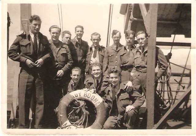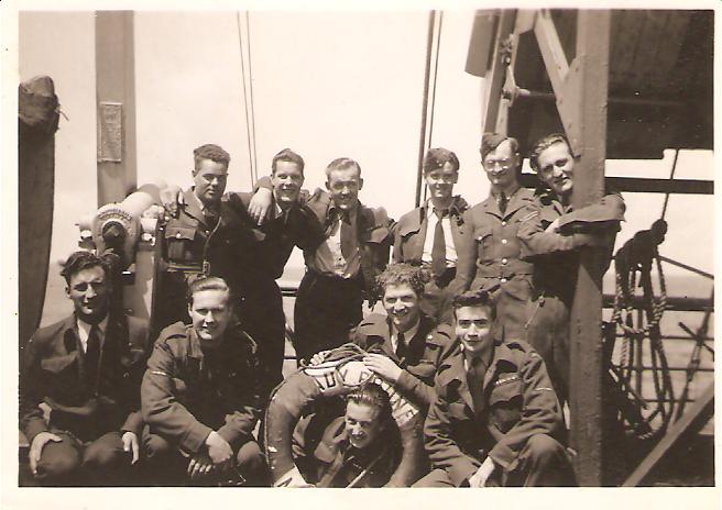 Servicemen returning to Canada after the Second World War onboard the Troopship LADY RODNEY - May 1946 Andre Bayard, kneeling behind Kisby ring
