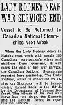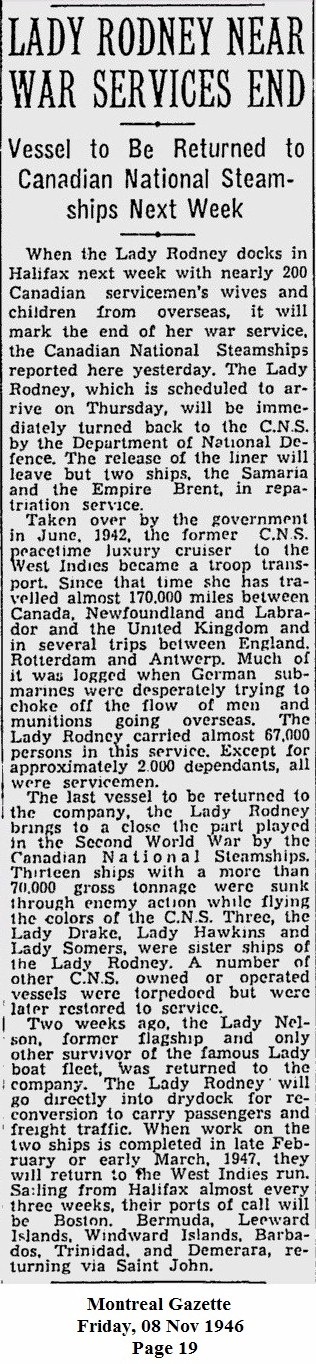 In 1929 she was owned by the Canadian National (West Indies) Steamships, Ltd, Montreal, QC and LADY RODNEY Ltd., Toronto, ON. The LADY RODNEY was the last remaining liner CNS fleet to be taken over by Department of National Defence. She served as a troopship between Canada, Newfoundland and Labrador. LADY RODNEY was the only one of the Lady Boats not sunk during WW2. As the war came to a close and troops were returned home, LADY RODNEY along with Lady Nelson, Aquitania, Scythia, Letitia, Ile de France, and Mauretania were pressed into service bringing home the Canadian War Brides and their children - approximates 27,000 brides and 9,000 children. Her service completed, LADY RODNEY was returned to her owners. LADY RODNEY Ltd sold her shares to Canadian National (West Indies) Steamships Ltd in 1952. In 1953 she and her sister Lady Nelson were sold to Egypt for $750,000, complete with all fittings and accessories. After being refitted at Alexandria and then renamed, they were used to carry passengers in the Mediterranean and Red Seas.