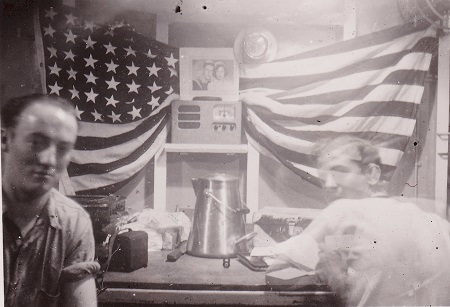 "Mess deck on LCI 121, Southampton, England. An American flag is displayed by crew in protest against officers. Crews of several craft were close to mutiny in early 1944"