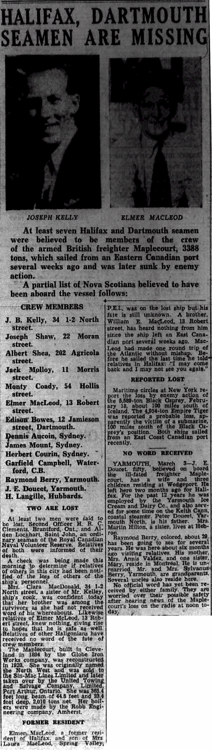 Maplecourt was a Defensively Equipped Merchant Ship (DEMS). Though manned by a civilian crew, she had RCN sailors on board to man and operate the gun that was fitted to her for protection and convoy defence