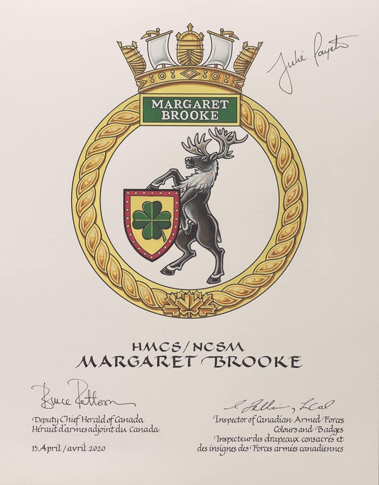 HMCS MARGARET BROOKE was named after LCdr Margaret Brooke, Nursing Sister, RCN, decorated for gallantry during the Second World War. The actions followed the torpedoing and subsequent sinking of the Newfoundland ferry SS Caribou on October 14, 1942, in the Cabot Strait off Newfoundland.
