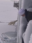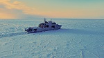 (MBK003) Sailor 1st Class Celine Dorion stops for a wave on sea ice flow as she makes her way through the snow while the future HMCS MARGARET BROOKE is parked for ice sampling in Labrador sea during ice trials on 27 Feb 2022. Photographer: S2 Taylor Congdon