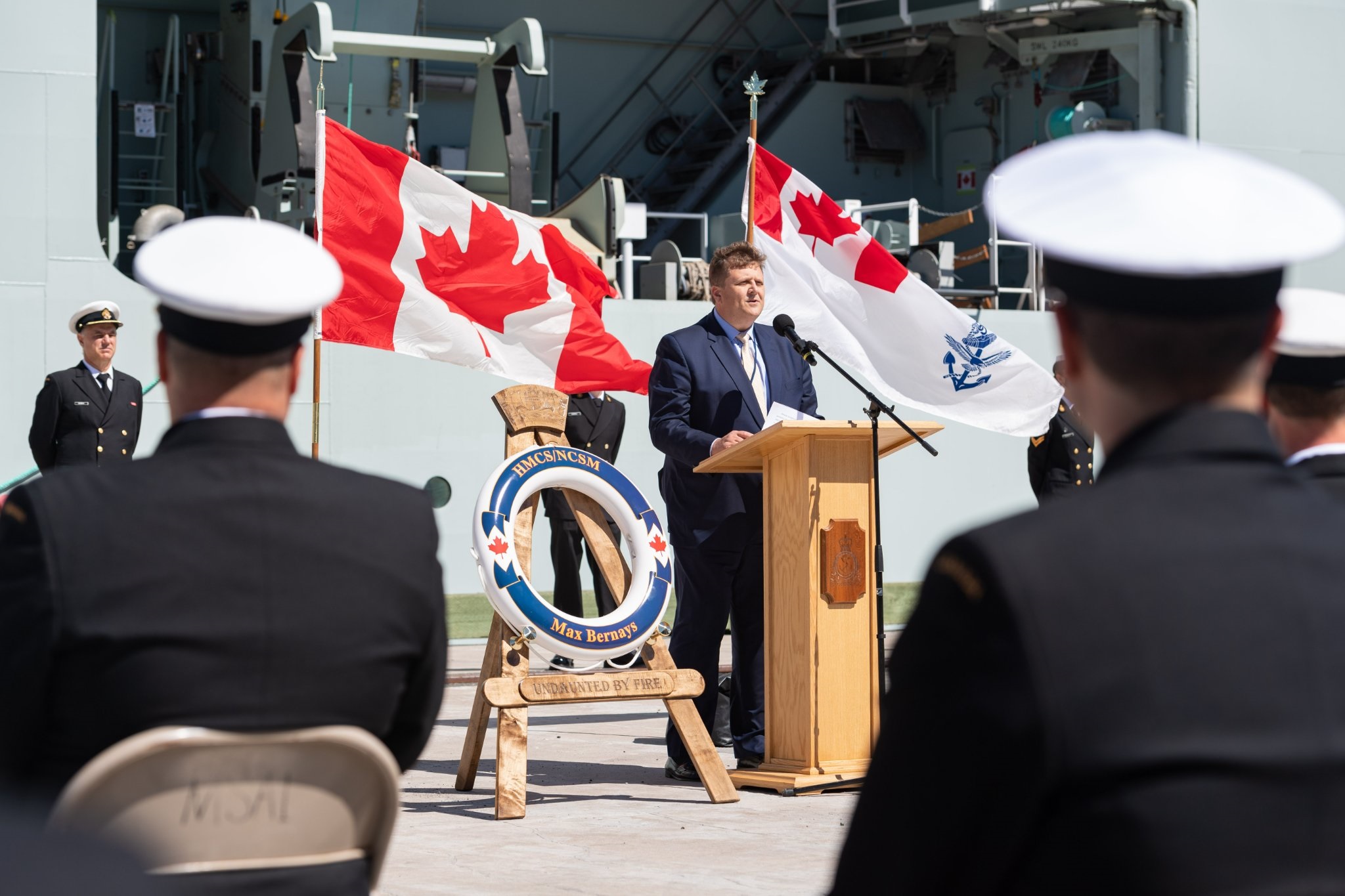 HMCS MAX BERNAYS, the third Arctic and Offshore Patrol Ship (AOPS) is named after Chief Petty Officer Max Bernays, a Canadian naval hero who served as the Coxswain of HMCS Assiniboine during the Second World War’s Battle of the Atlantic.