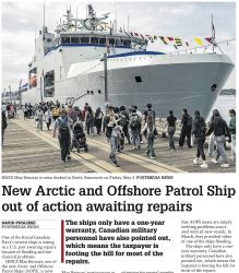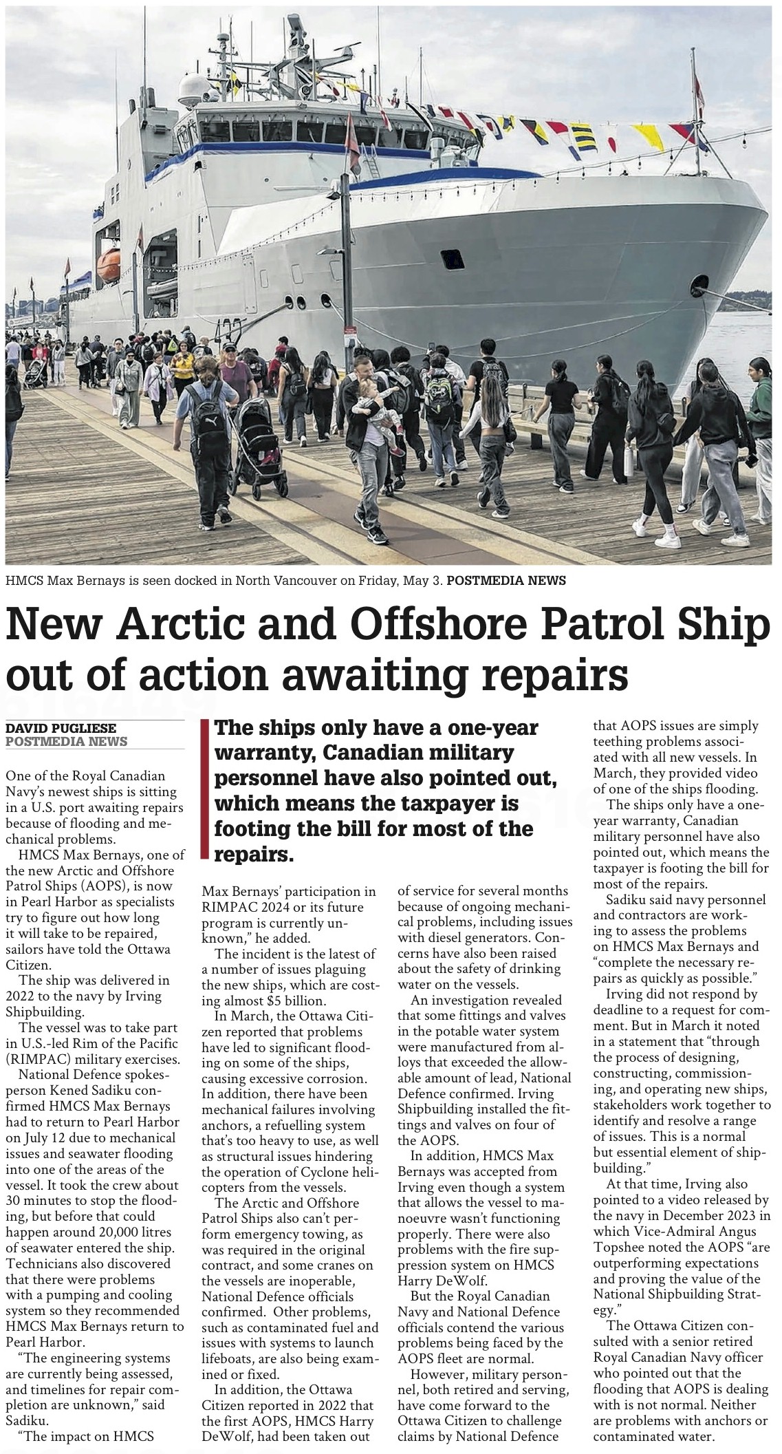 Article on the delivery of MAX BERNAYS to the RCN and the teething problems of HMCS HARRY DEWOLF The Halifax Chronicle-Herald 03 Sep 2022