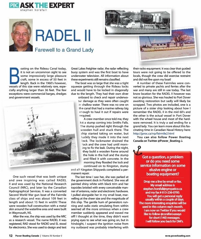 After the Second World War Fairmile Q051 was registered by the name “ Radel II “, RAD- stood for RADIO, and EL- stood for ELECTRONICS. The National Research Council used former Q051 as research vessel. She designed and tested Great Lakes freighter radar, the radar reflecting buoy system and was the first boat in the world to have underwater television. Information about her experiments, remains classified. She was later sold to Commander C. H. Hudson, Vancouver when she left government service.