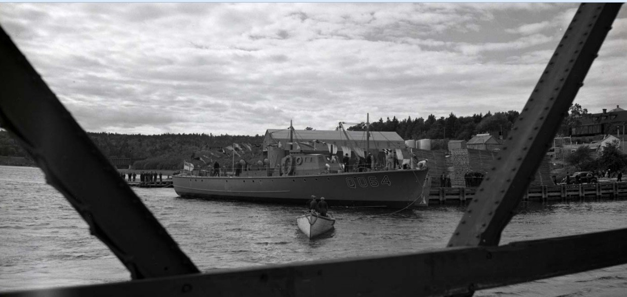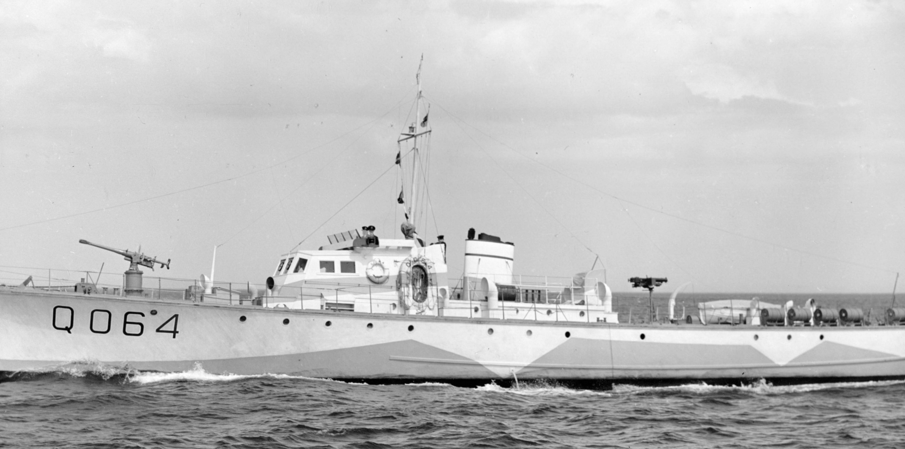 Built by LeBlanc Shipbuilding Co., J.H., Weymouth, N.S., she was delivered to the RCN on 18 Apr 1942. While she flew the White Ensign, she was not commissioned into the RCN but instead was listed as a tender to HMCS Sambro, the depot ship for escorts (tenders were not commissioned vessels). In Mar 1943, Q064 rescued the flight crew of a Catalina flying boat that had crashed 1 mile offshore and was on fire. In Mar 1944 and Jan 1945, ML Q064 was part of the 72 ML Flotilla. On 06 Mar 1944, her CO, Lt Jarvis was listed as the SO of the 72 ML Flotilla. In 1947, she was sold and renamed Six-Four. She foundered in 1952.