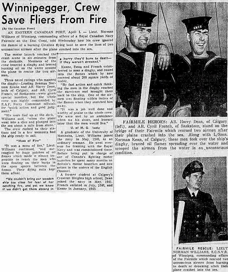 (Q064-001) ML Q064 // RCN Photo # H-2694 // Courtesy of the Comox RCAF Museum (Q064-002) AB Harry Dean, AB Cyril French, LS Norman Kean of Q064 rescues RAF plane crew after crash // The Winnipeg Evening Tribune 01 Apr 1943 (Q064-003) Launching of the first Fairmile (Q064), for Imperial Oil - 1941 // Source: E.A. Bollinger Nova Scotia Archives accession no. 1975-305 1941 no. 109 // Photographer: E.A. Bollinger (Q064-004) ML Q064 // From the collection of William (Bill) Carey // Courtesy of William (Bill) Carey / Jeff Tripp (Q064-005) ML Q064 and ML Q080 alongside at unknown location // From the collection of George Beatty Sterne, CPO.MM // Courtesy of Bob Sterne