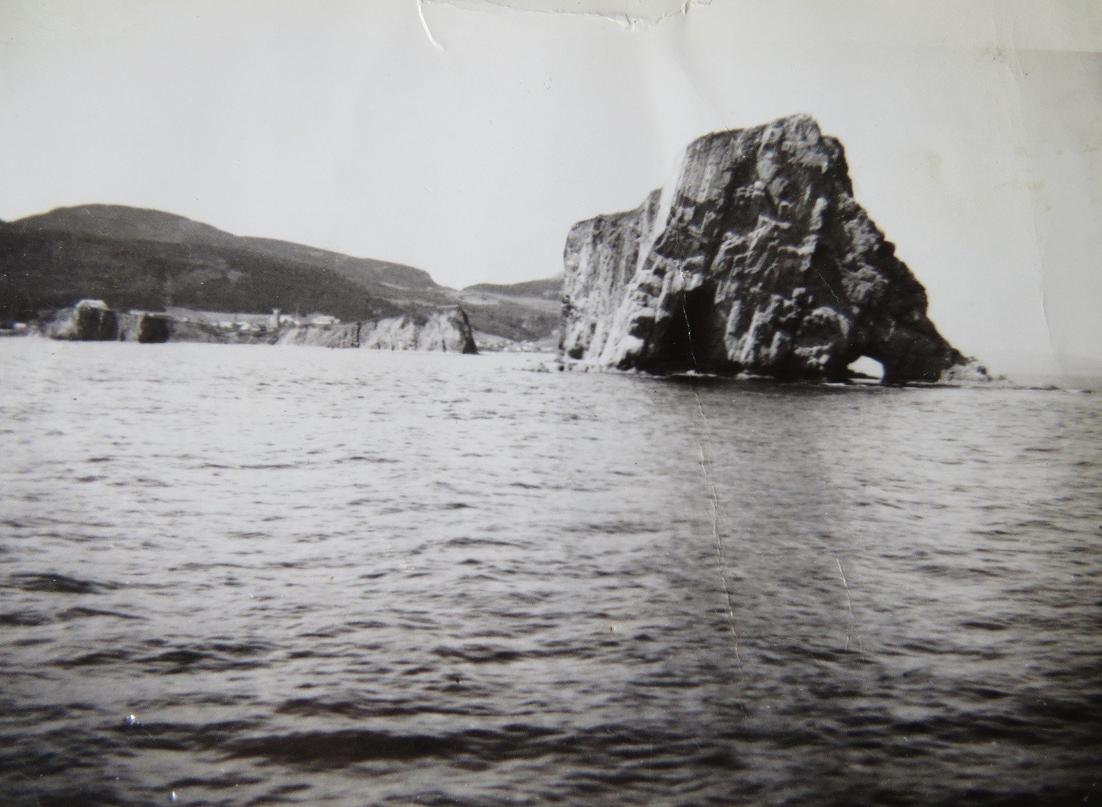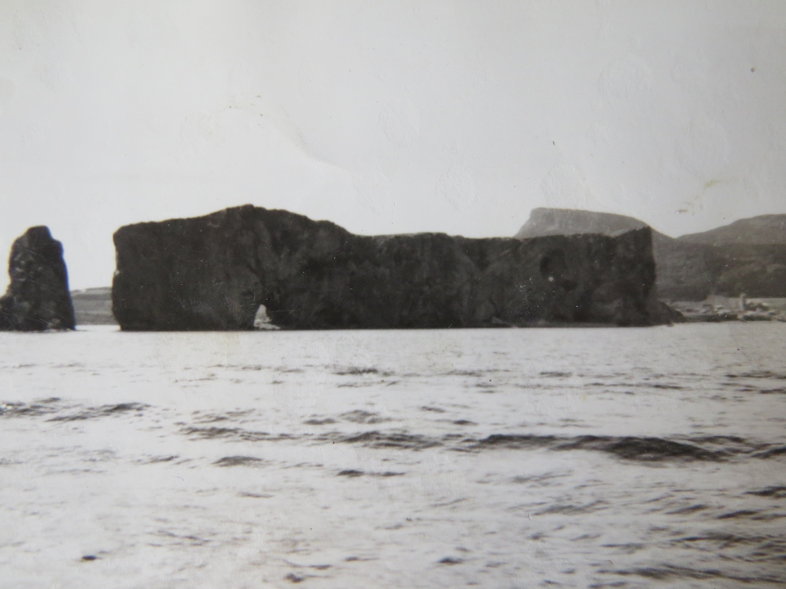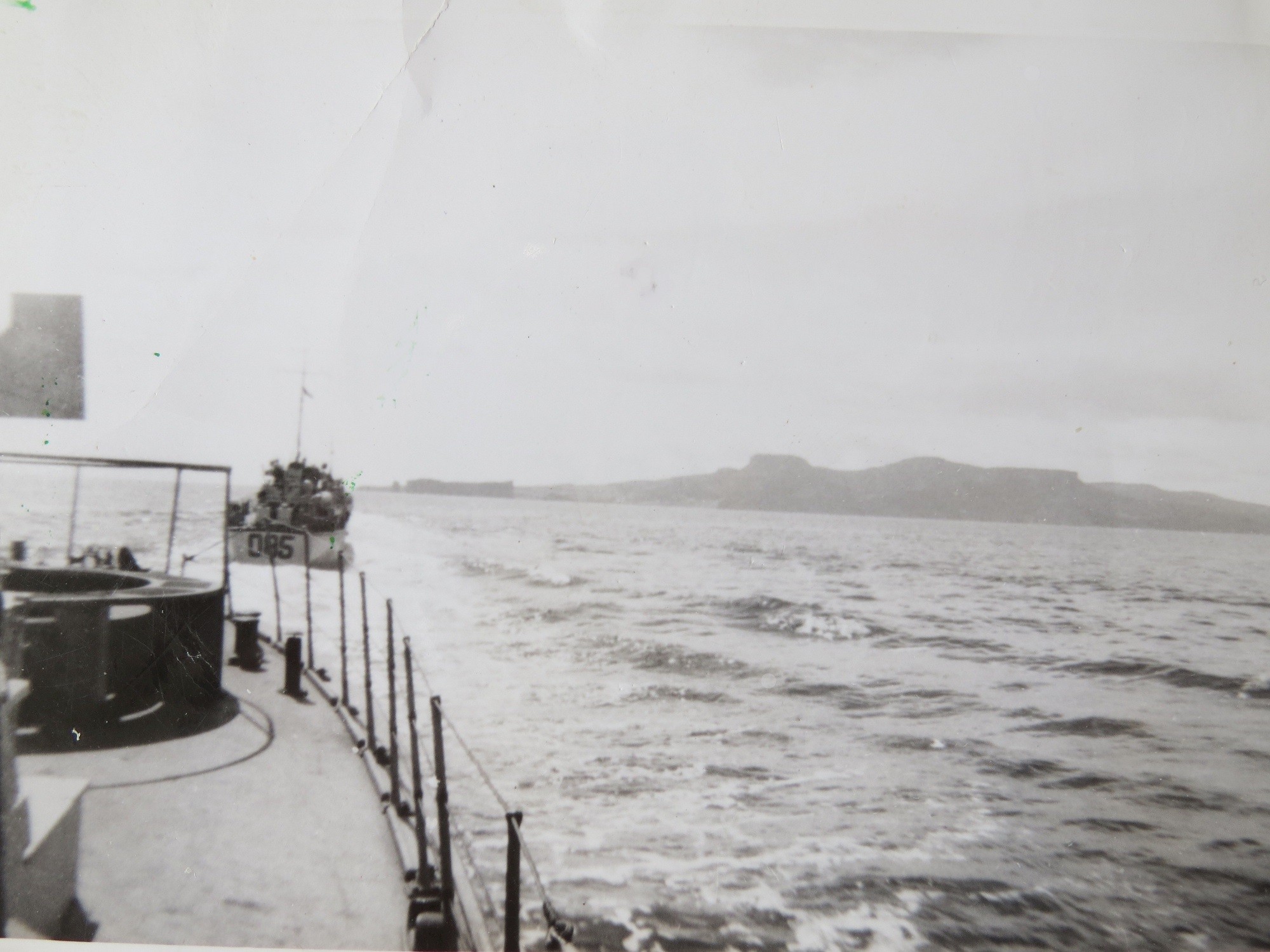 Percé Rock off the tip of the Gaspé Peninsula, Gulf of St. Lawrence (GES015) Fairmiles approaching Percé Rock, ML Q085 in the lead (GES016) Sailors on unknown Fairmile with Percé Rock in the background (GES017) Percé Rock