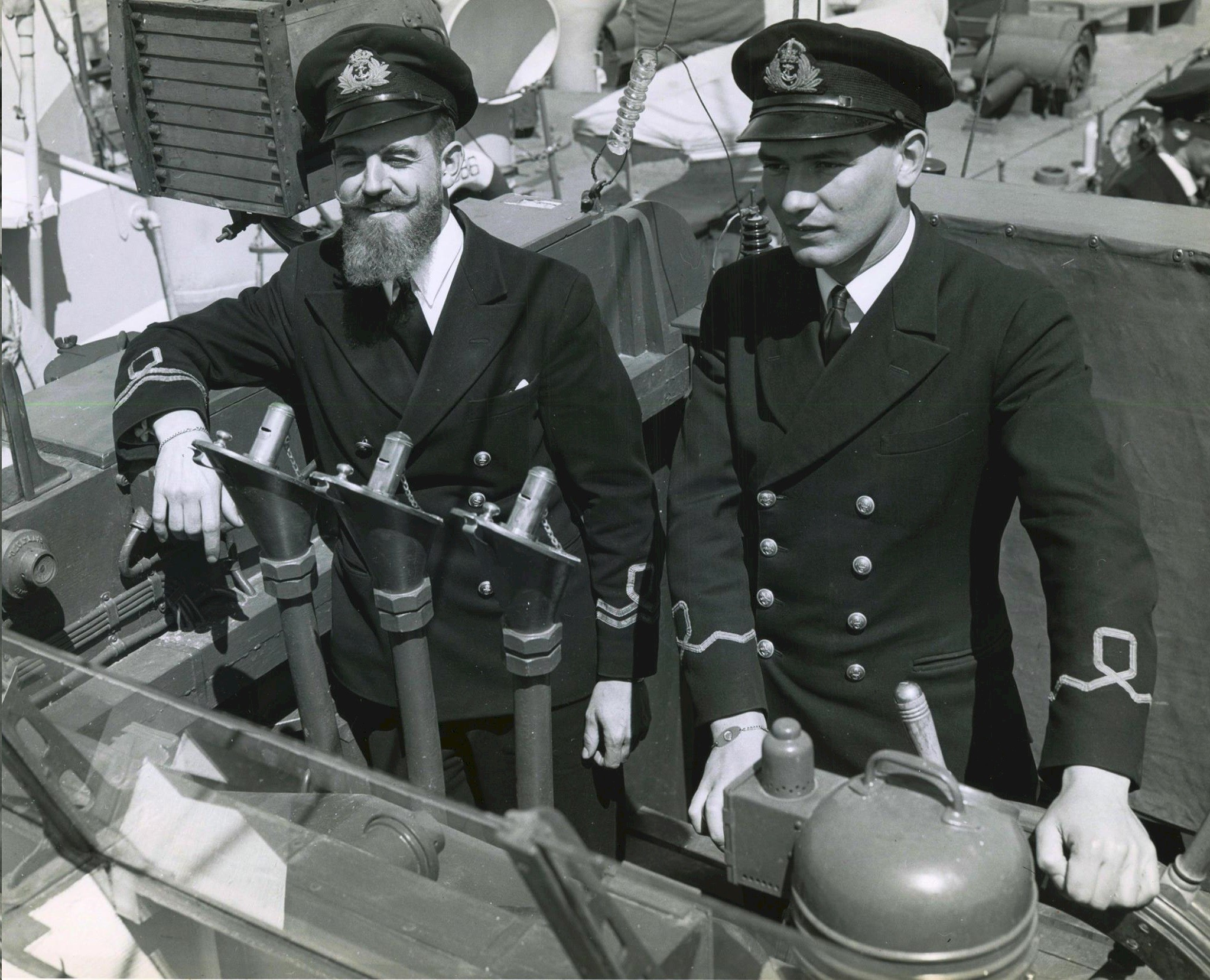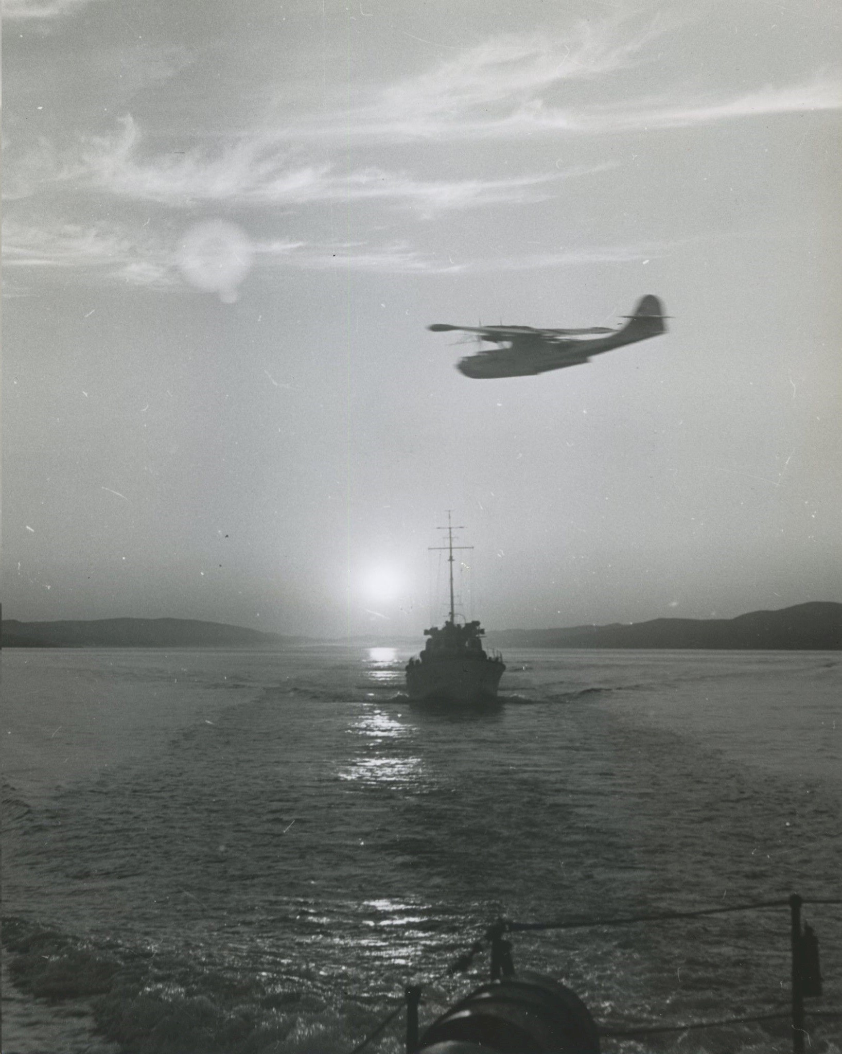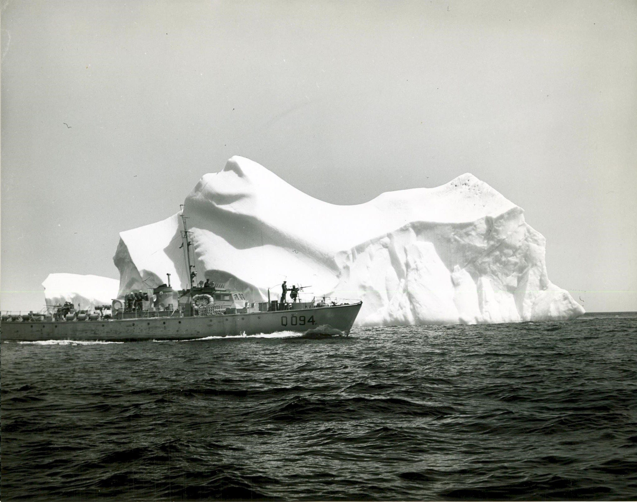 (Q094-001) ML Q094 passing an iceberg near Newfoundland // The MLs used the iceberg for target practice. You can see the shell holes in the upper right corner of the iceberg // DND / RCN photo // From the collection of Clarence Van Tighem // Courtesy of Paul Van Tighem (Q094-002) Flying-boat flying over Q094 // From the collection of Clarence Van Tighem // Courtesy of Paul Van Tighem (Q094-003) Lt Albert Perry Morrow (2nd CO of Q094) with SLt Clarence Van Tighem (who became 3rd CO of Q094) // From the collection of Clarence Van Tighem // Courtesy of Paul Van Tighem (Q094-004) ML Q094 with Q103 and Q076 following astern // RCN Photo # F-978 // Courtesy of the Comox RCAF Museum