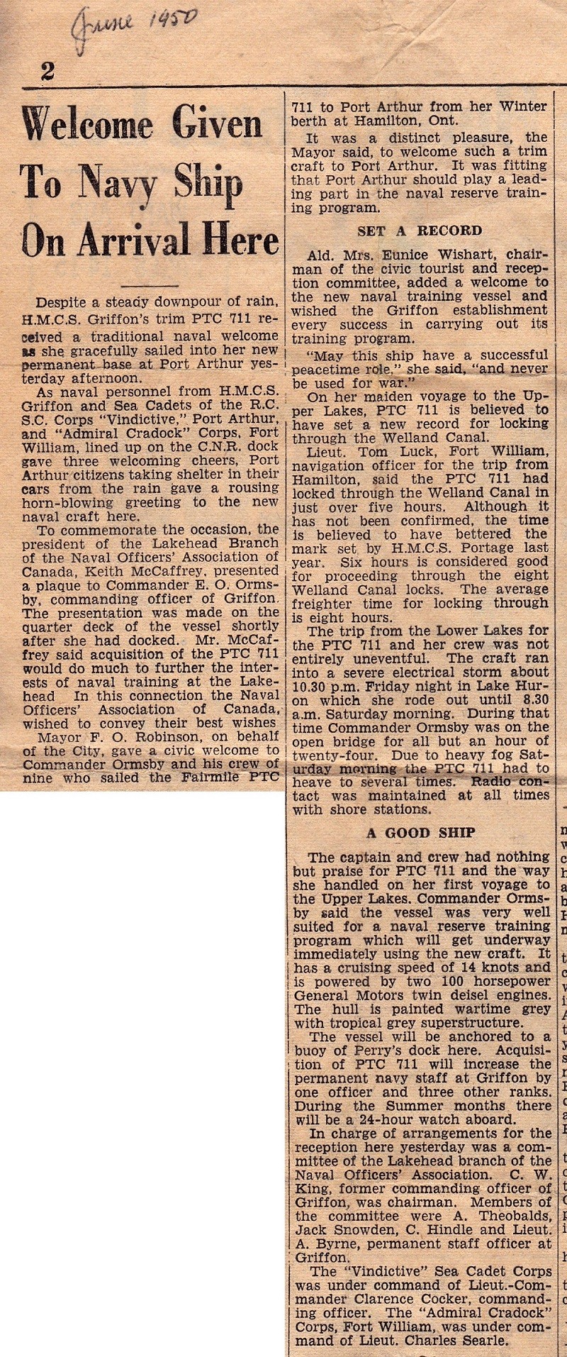 (MSE001) HMCS MOOSE 711 // RCN Photo # COND-1013 // Courtesy of the Comox RCAF Museum (MSE002) Newspaper article from a Port Arthur, ON newspaper on the arrival of PTC 711 at HMCS Griffon - June 1950 // Courtesy of Bill Kellerman (MSE003) Newspaper article from the Picton Gazette, Picton, Ont. on the visit of 6 RCN vessels - 14 Jul 1954 // Courtesy of John Lyons
