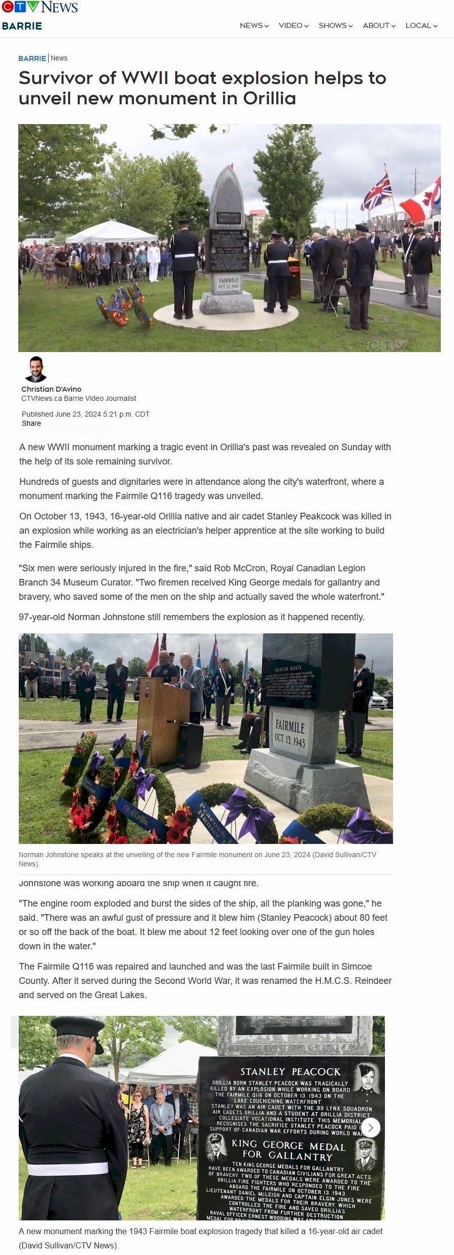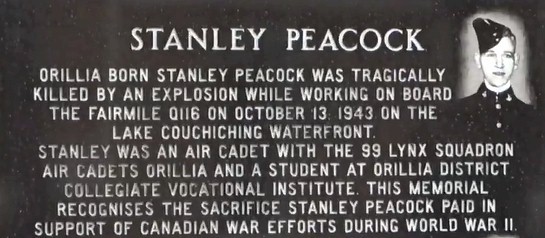 In Memory of Stanley Peacock, Royal Canadian Air Cadet, who died when an explosion occurred during the construction of ML Q116 Click on the above image to read an article on the memorial raised in his name Source: CTV New, Barrie, Ontario