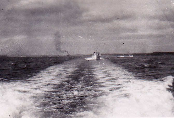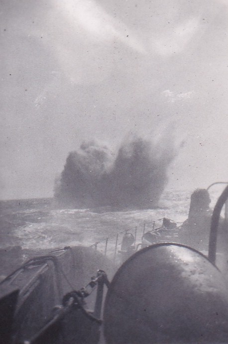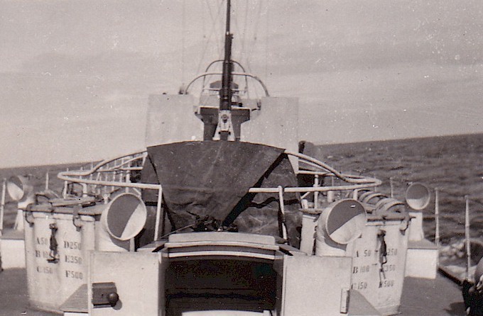 (TM04) Ted McCullogh on ML Q120 (TM05) Unidentified Fairmile following astern of ML Q120 (TM06) Depth charge exploding astern of ML Q120 (TM07) Stern gun mount of Q120. Note the depth charges along the rails on the port and starboard sides (TM08) Ted McCullogh on ML Q120