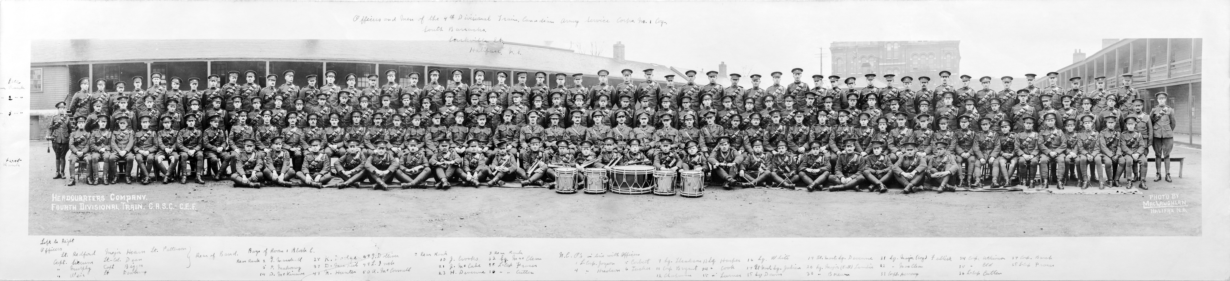 Headquarters Company, Fourth Divisional Train, C.A.S.C. - C.E.F. "Officers and men of the 4th Divisional Train, Canadian Army Service Corps, No 1., Coy., South Barracks, Sackville St., Halifax, NS
